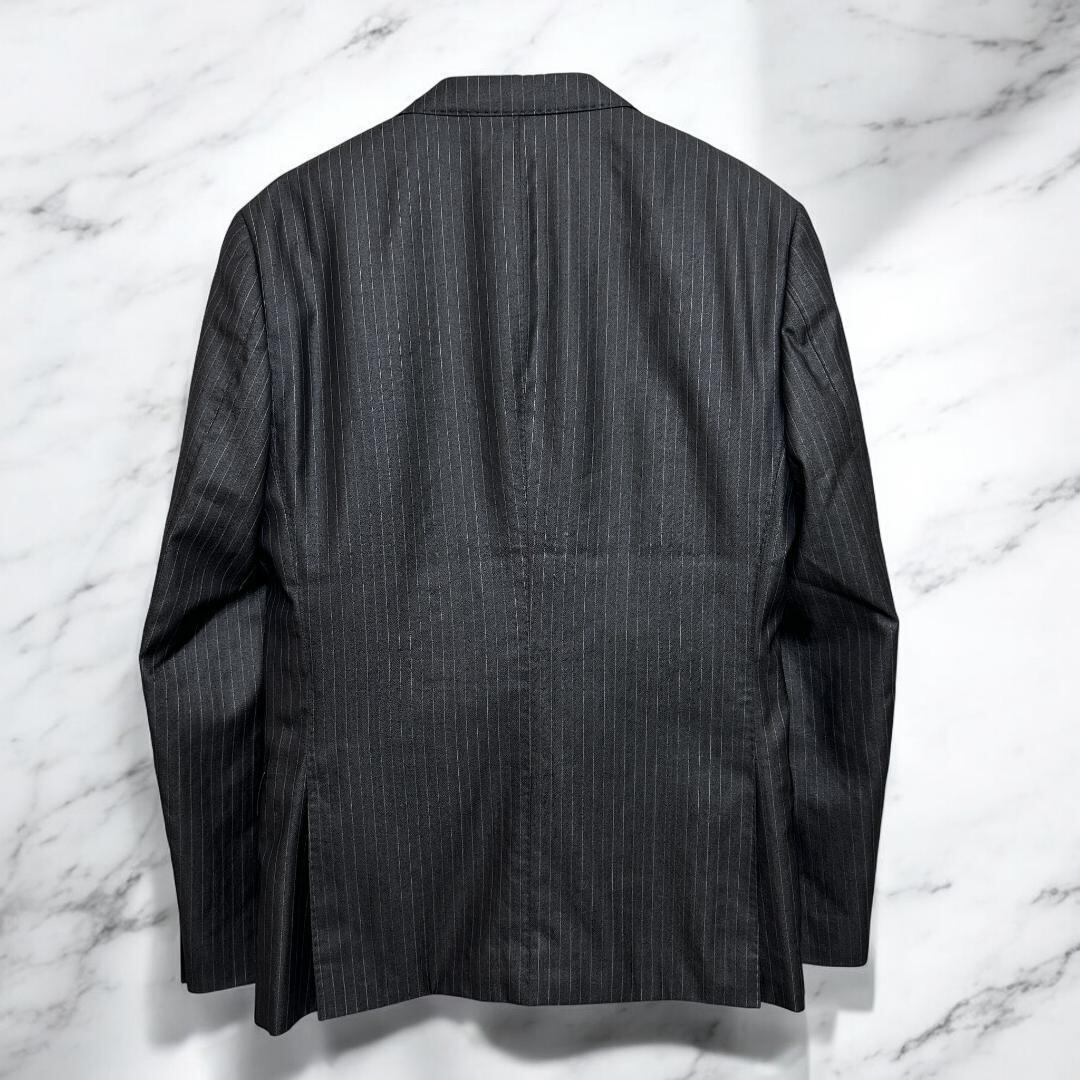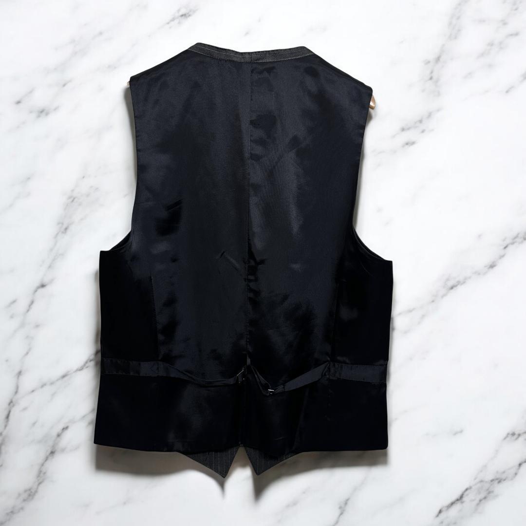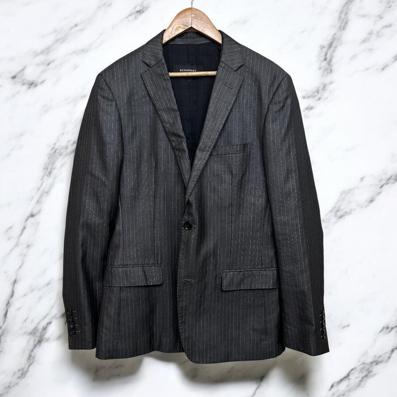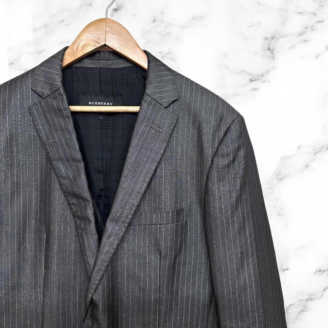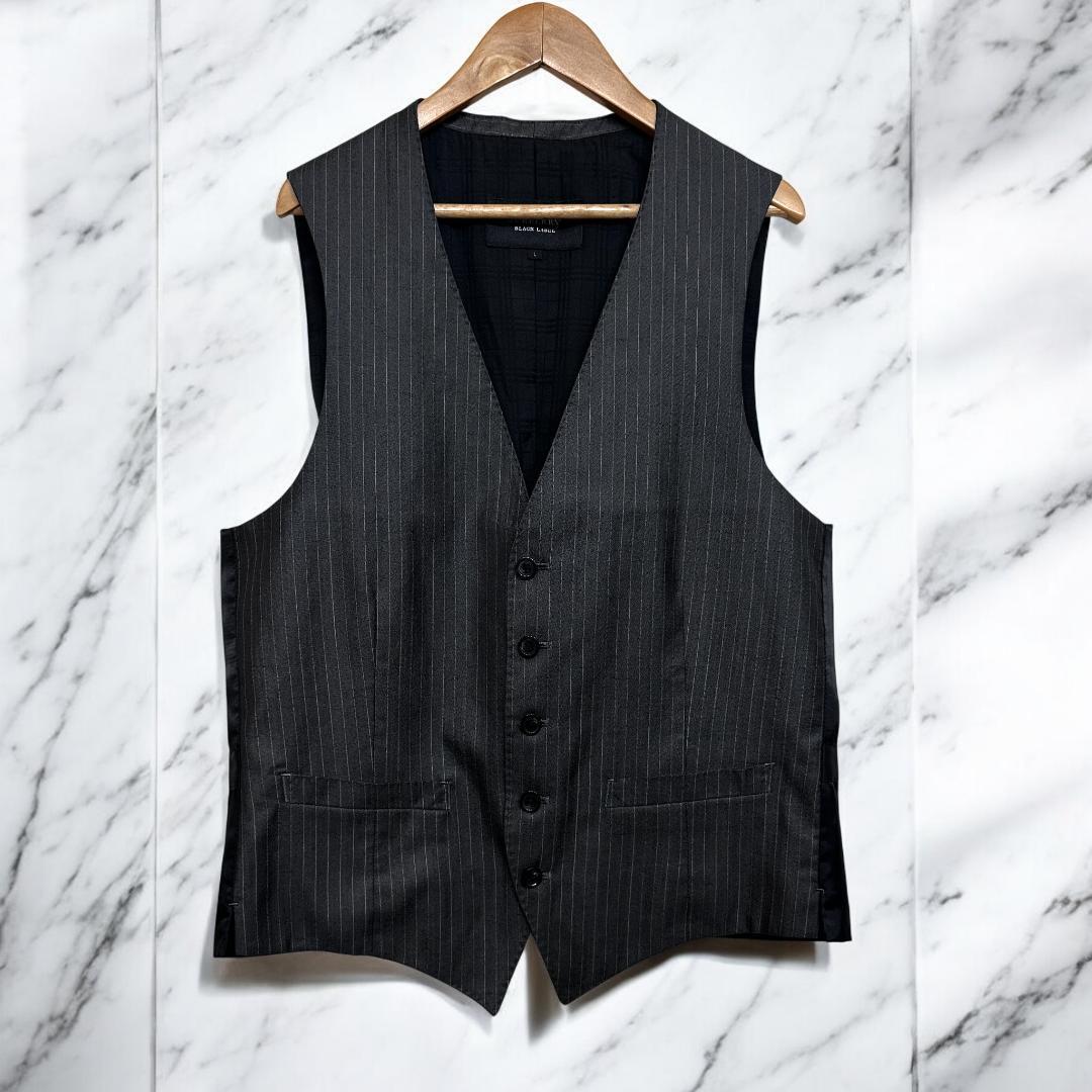 BURBERRY BLACK LABEL(バーバリー ブラックレーベル)のスリーピーススーツ(ジャケット+ベスト+スラックス)です。クラシックなチョークストライプ柄はビジネスシーンやフォーマルな場面に最適で、洗練された大人のスタイルを演出します。高品質な素材と丁寧な仕立てで定評あるコレクションの一着です。