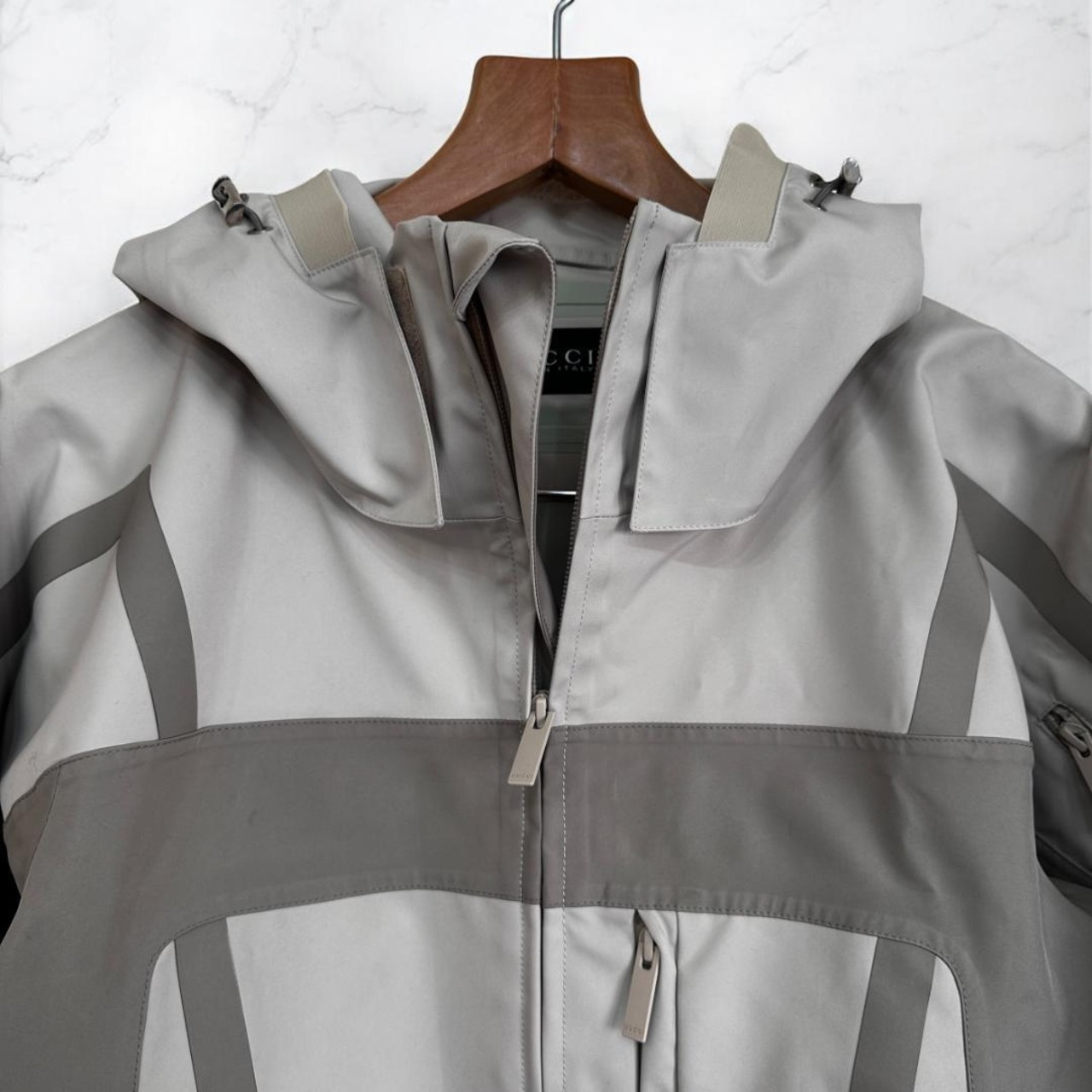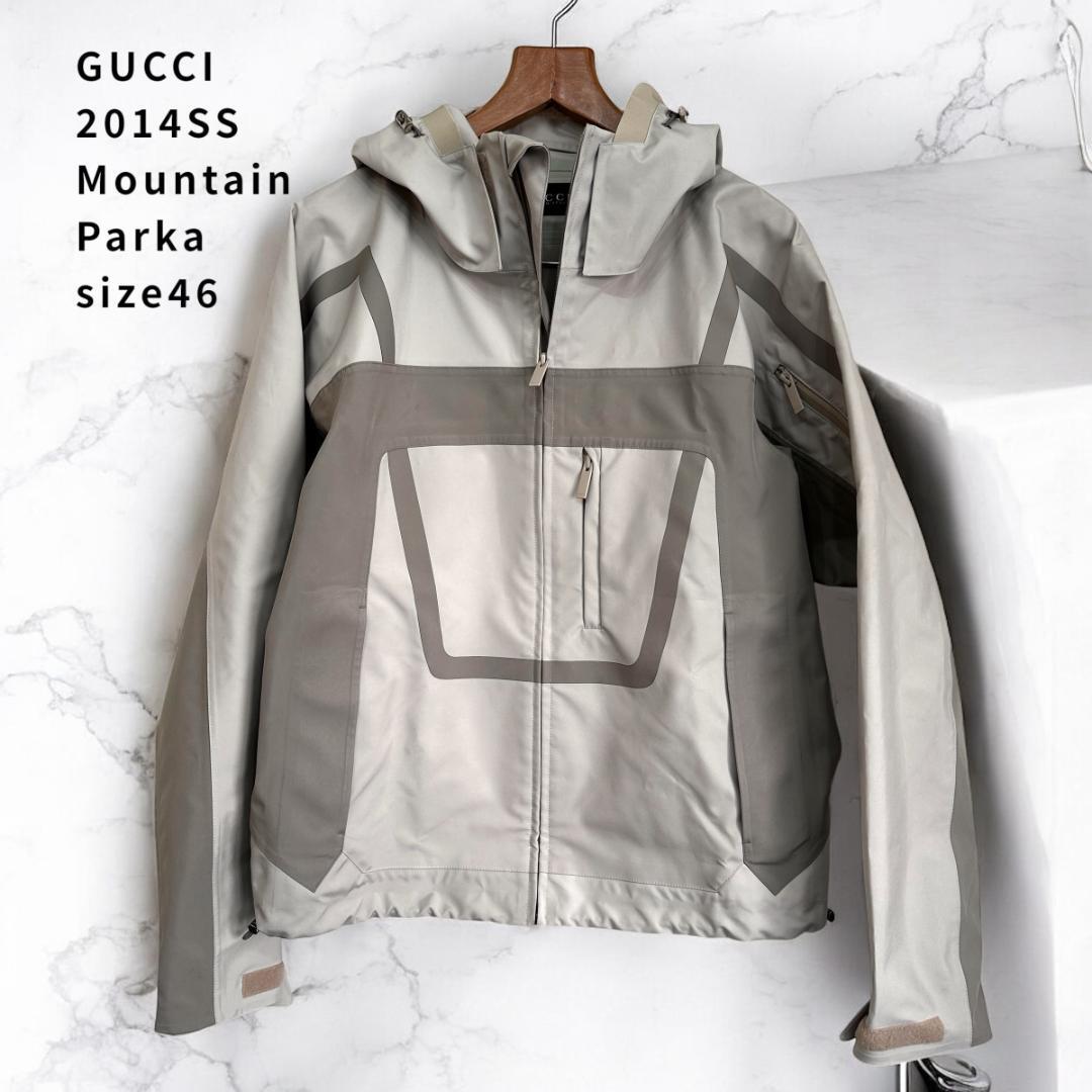 GUCCI(グッチ)の2014年春夏コレクションより「Mountain Parka(マウンテンパーカ)」です。スポーティなデザインとラグジュアリーブランドらしい上質な仕上がりが魅力の一着。アウトドアテイストながらもスタイリッシュで、カジュアルスタイルのアクセントに最適です。サイズ46表記で、メンズとしては標準〜ややゆとりあるサイズ感です。