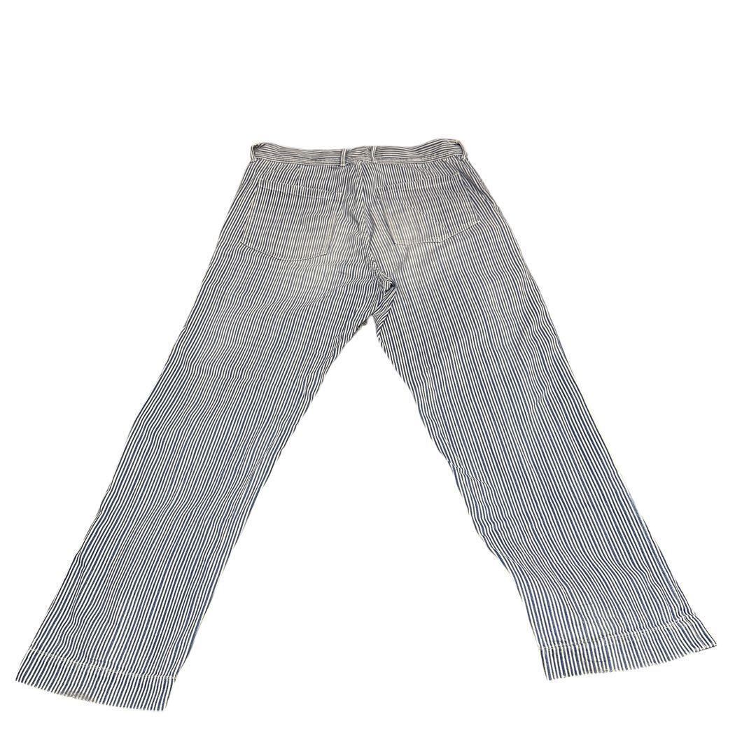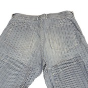 45rpmのBakkuriiヒッコリーデニム。やや使用感があるように見えますが、元々かなり加工が施されたアイテムです。ヒッコリーパンツは世の中に沢山ありますが、よく見ると、太いストライプと細いストライプがランダムなっている為、とても立体的なヒッコリーストライプに見えます。その為、トップスにチェック柄やストライプシャツを合わせてもオシャレに決まります。また、ベイカーパンツをゆったりさせたようなシルエットなので、ヒップ周りにゆとりはあるが、裾幅は程よくテーパードしている為、ワイドパンツに飽きてしまった方にはとてもオススメなシルエットです。リラックス感あるシルエットですが、生地はデニム地のようにしっかりとしつつ、加工しているので非常に柔らかい為、オールシーズンご活躍いただけます。ユニセックスパンツなので、男女共にオススメの1本です。