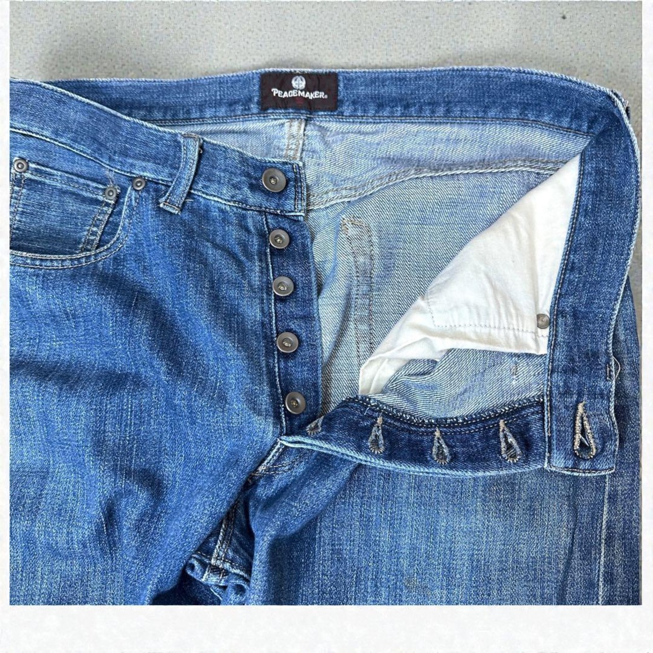 PEACE MAKERのライトオンス ストレートデニムです。程よく軽さのあるデニム生地で、通年着用しやすい一本。バックプリントがアクセントになっており、シンプルなトップスと合わせるだけで存在感のあるスタイリングが楽しめます。ストレートシルエットのため、カジュアルからストリート寄りのコーディネートまで幅広く対応します。