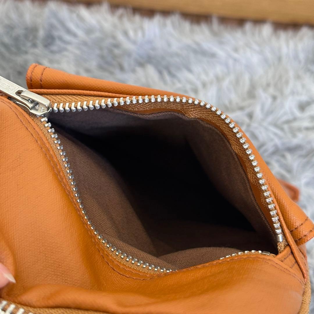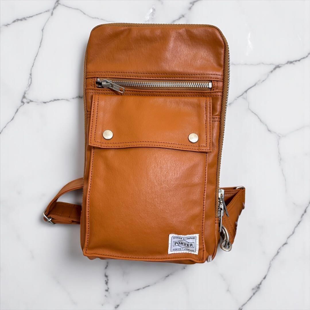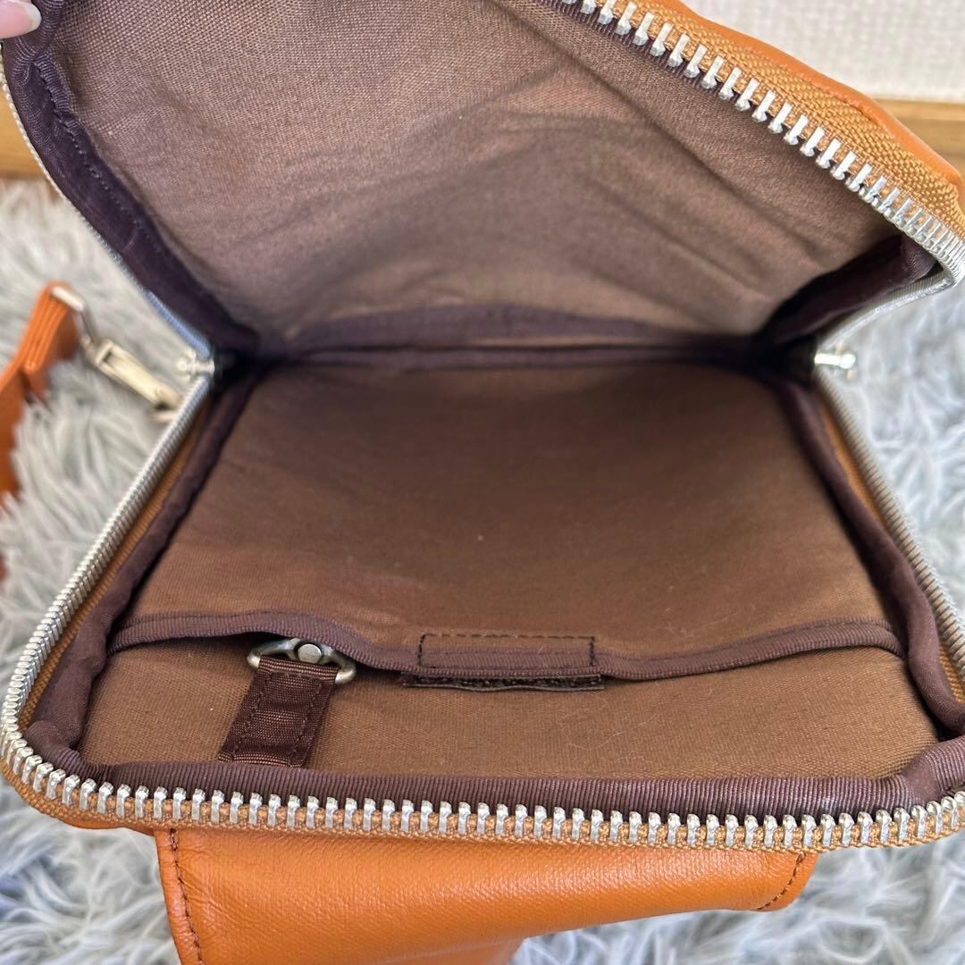 POTERのショルダーバッグです。落ち着いたブラウンカラーで、カジュアルからきれいめスタイルまで幅広く合わせやすいデザイン。スリムなフォルムで、必要最低限の荷物をすっきり持ち運べるコンパクトタイプです。