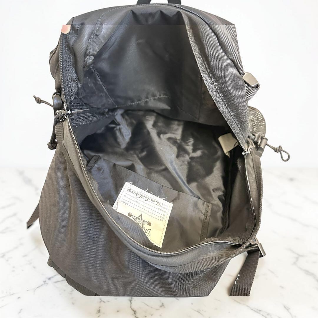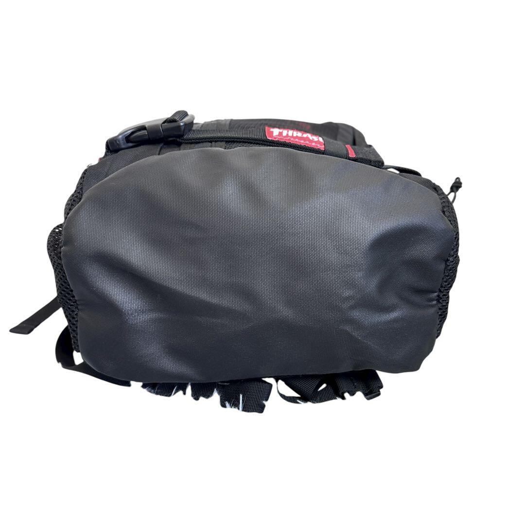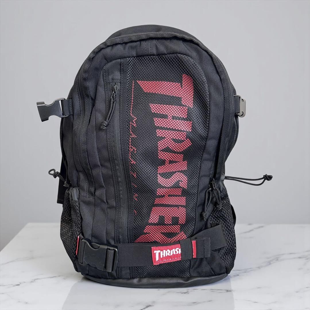 メッシュパネルとサイドポケットを備えたTHRASHERのブラックリュック。