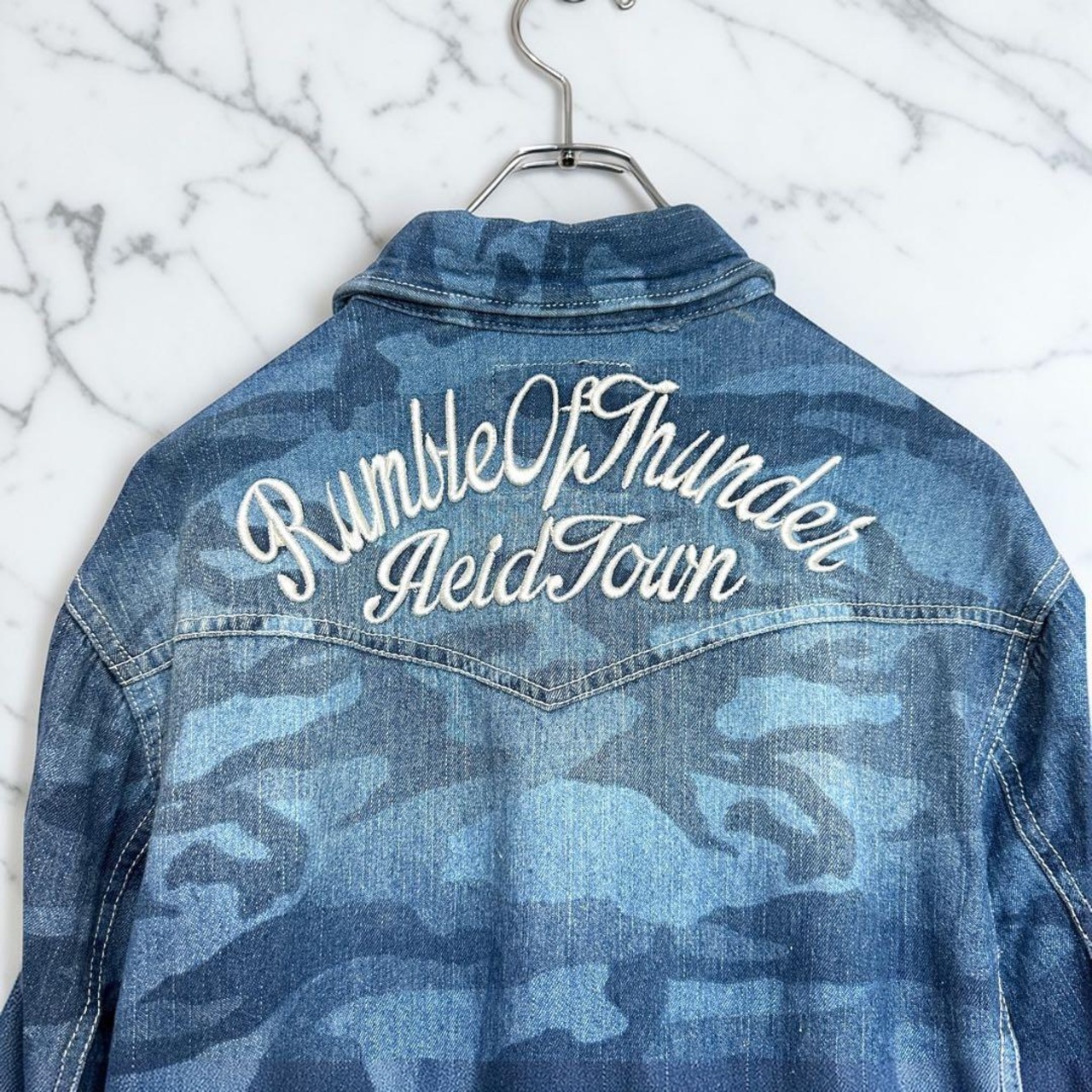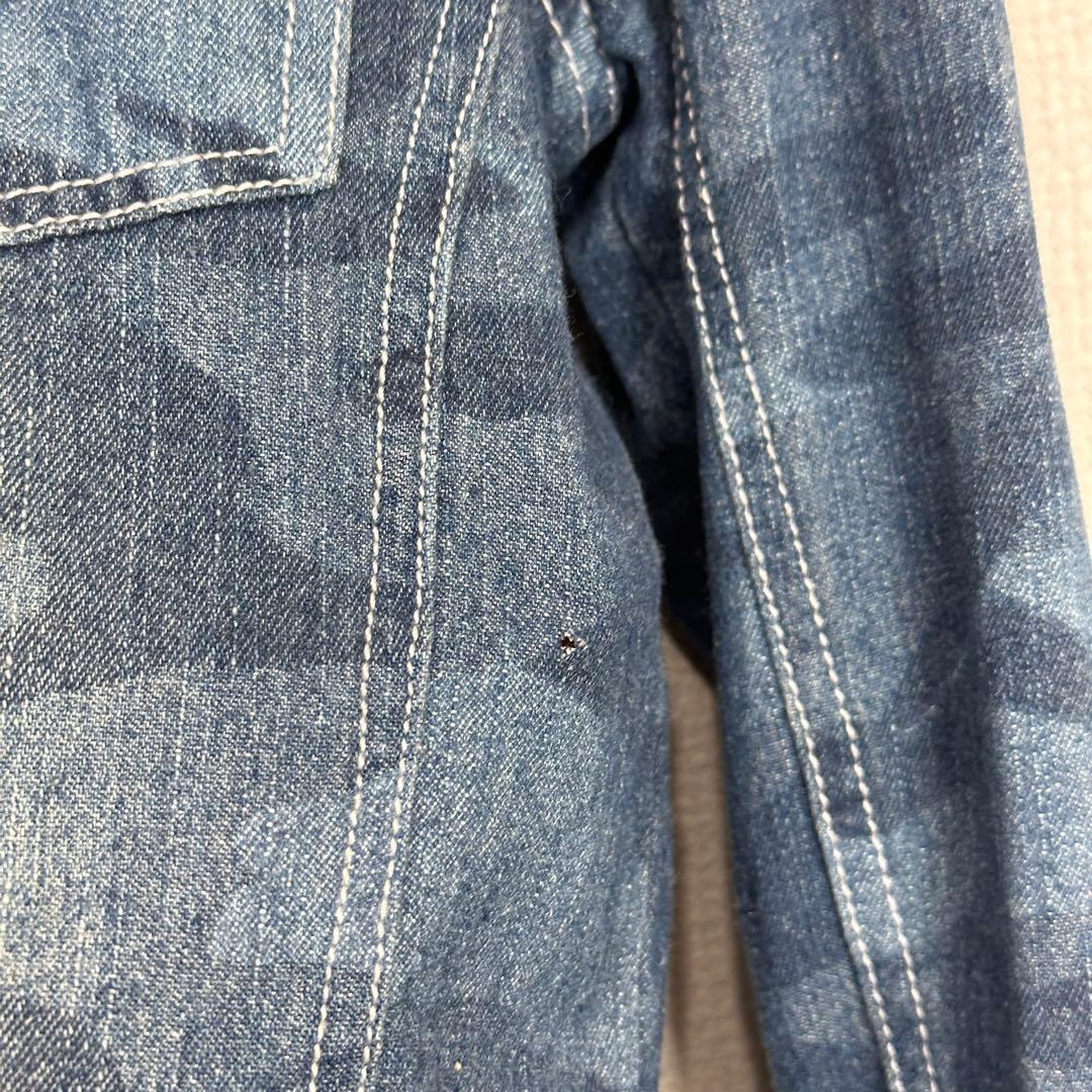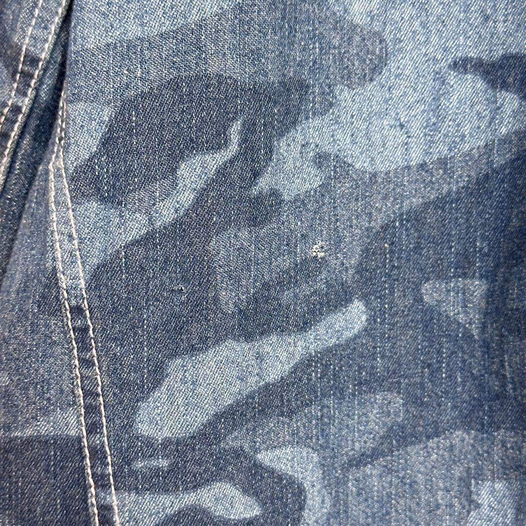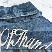 迷彩デザインが印象的で、コーディネートのアクセントとして活躍する一着。デニム素材ならではのしっかりとした生地感で、羽織りとしてもトップスとしても着用可能です。