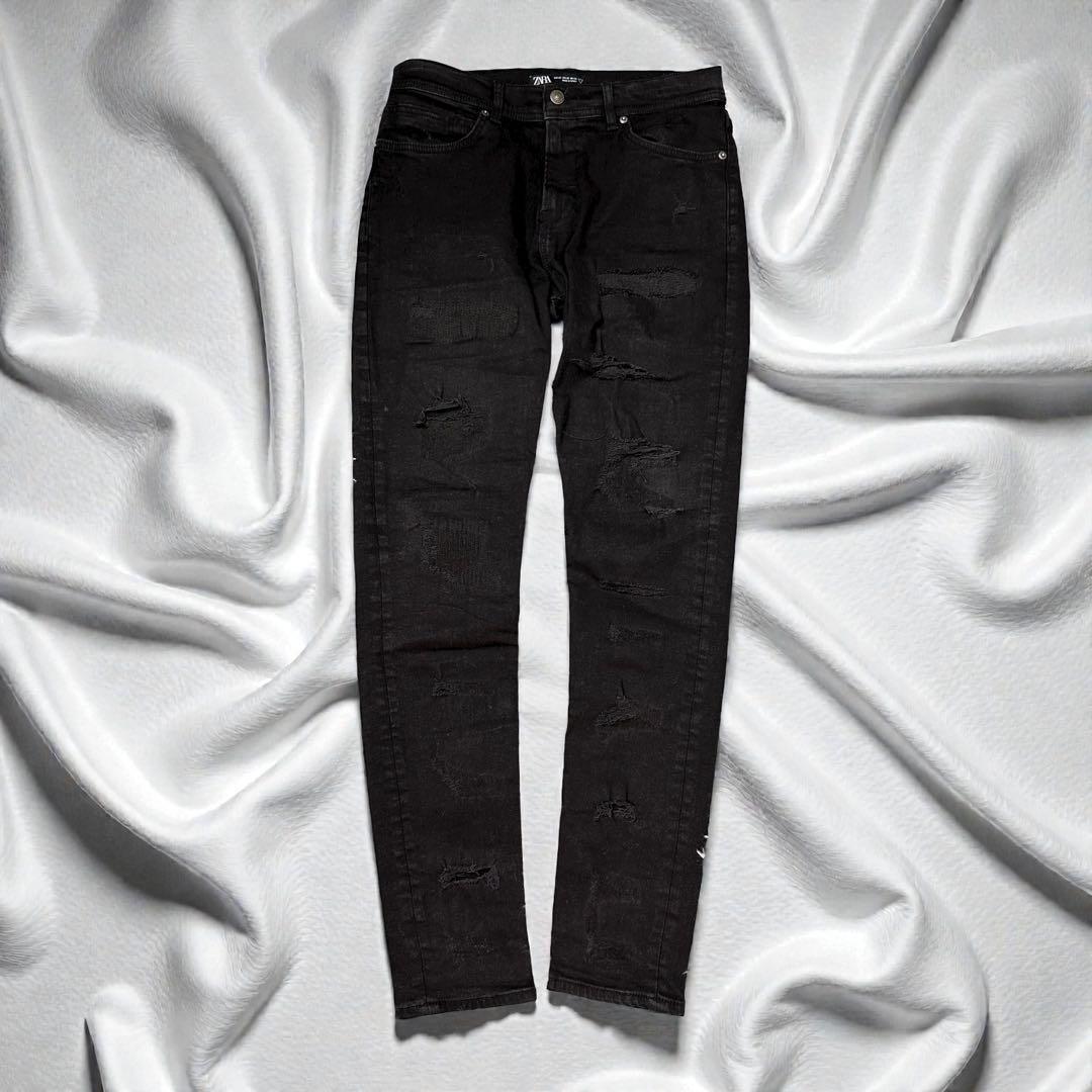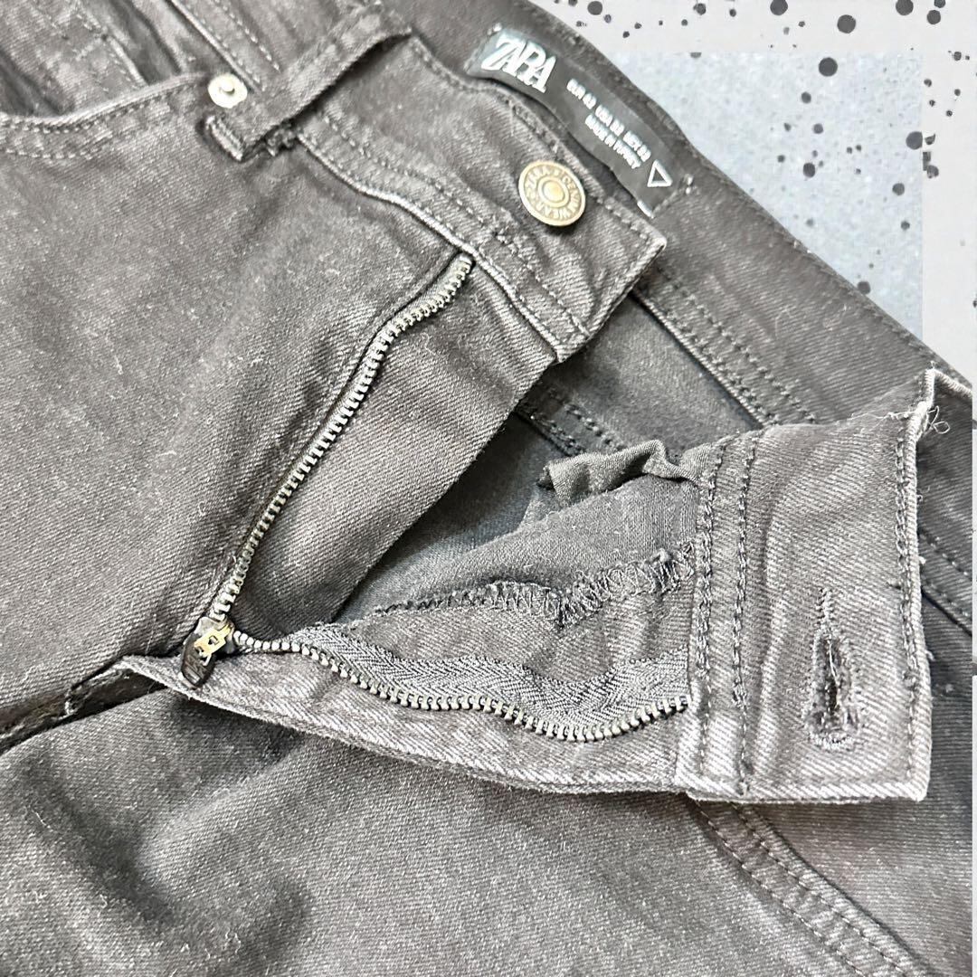 ZARAのブラックデニムパンツです。すっきりとしたブラックカラーで、カジュアルからきれいめスタイルまで幅広く活躍する一本。程よい厚みのデニム生地で、オールシーズン着用しやすいアイテムです。シンプルなデザインのため、トップスを選ばずコーディネートしやすいのも魅力です。
