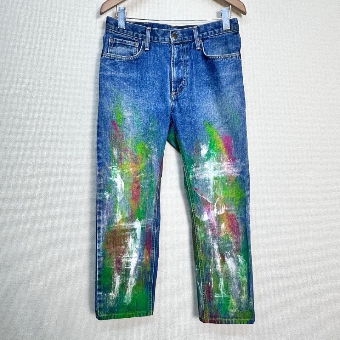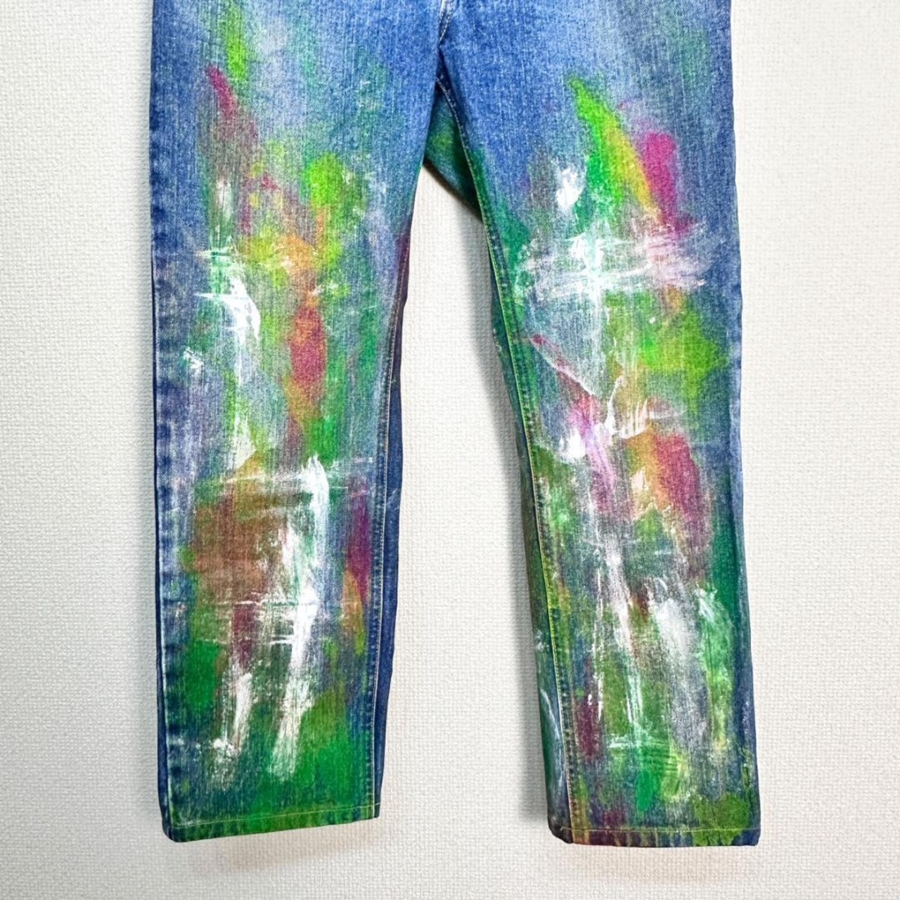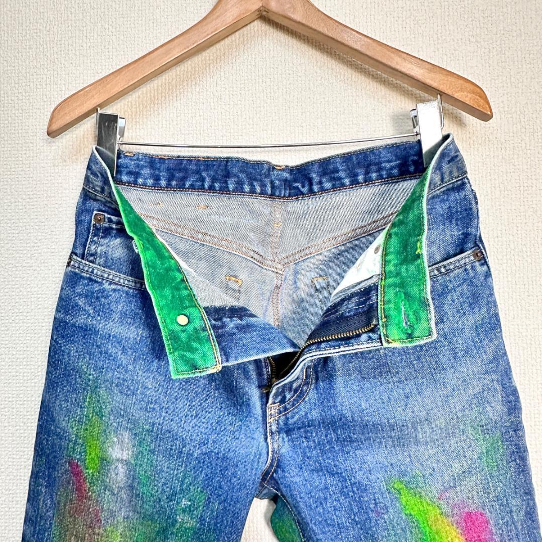 白・ピンク・緑のカラーブロックが印象的なリメイクデニムパンツです。ユニークな配色と一点物ならではの個性が際立つアイテムで、ストリートやカジュアルスタイルのアクセントに最適です。リメイクならではの雰囲気があり、普通のデニムとは異なるデザイン性を楽しめます。一般的な古着としての使用感がある場合もありますが、デザイン性が高い一着です。
