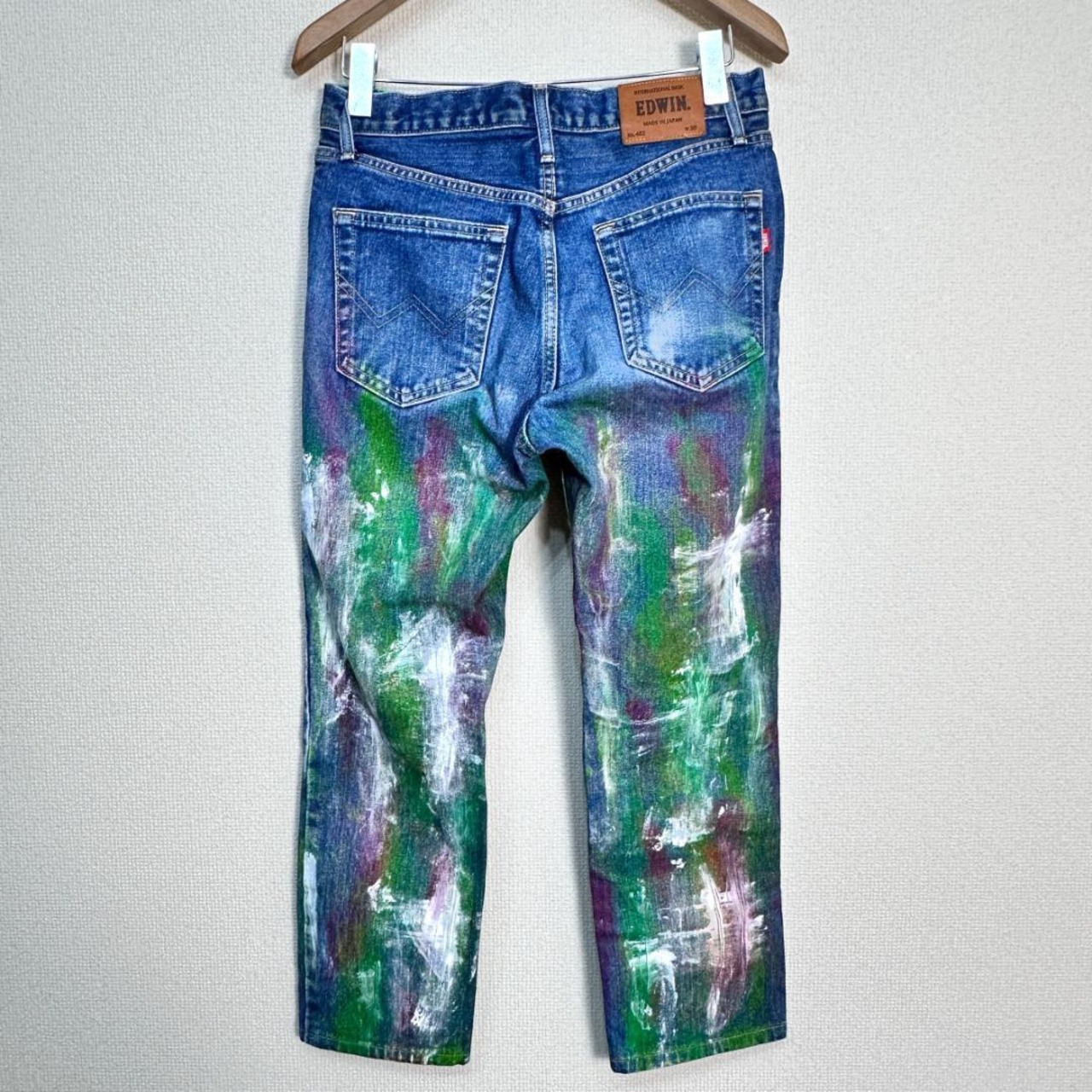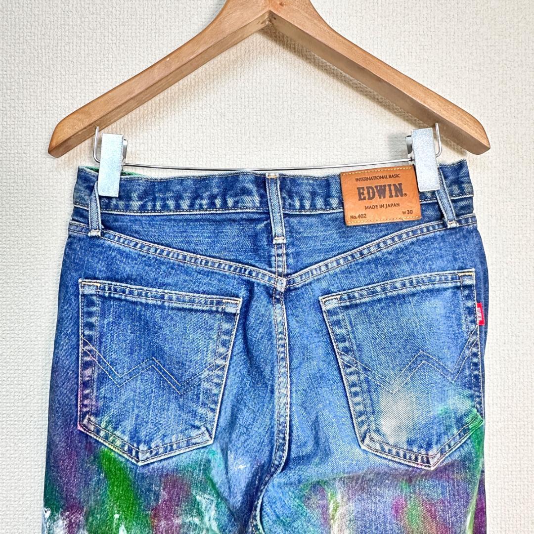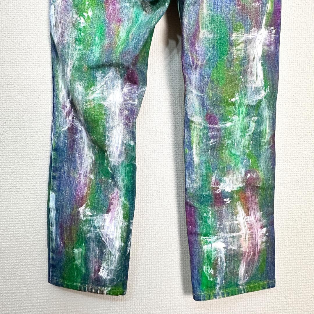 白・ピンク・緑のカラーブロックが印象的なリメイクデニムパンツです。ユニークな配色と一点物ならではの個性が際立つアイテムで、ストリートやカジュアルスタイルのアクセントに最適です。リメイクならではの雰囲気があり、普通のデニムとは異なるデザイン性を楽しめます。一般的な古着としての使用感がある場合もありますが、デザイン性が高い一着です。