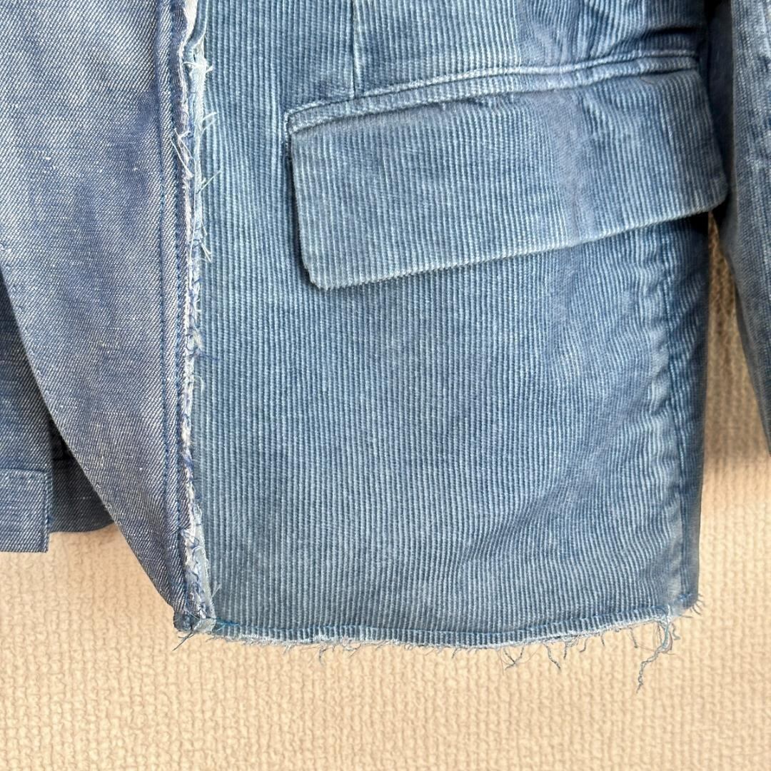 内側にリネン混素材、外側にコーデュロイ素材を使用したリメイクジャケットです。水色のやわらかなカラーが印象的で、コーデュロイ特有の畝感がコーディネートに立体感をプラスします。