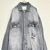 Wudge Boy(ワッジボーイ)のダメージ加工つなぎ(オールインワン)です。ブラックデニムをベースにした無骨な雰囲気で、全体に施されたダメージ加工が存在感のある一着。ストリートや古着ミックススタイルに相性が良く、これ一枚でコーディネートが完成します。デニム素材のため通年使いやすく、インナー次第で幅広い着こなしが可能です。