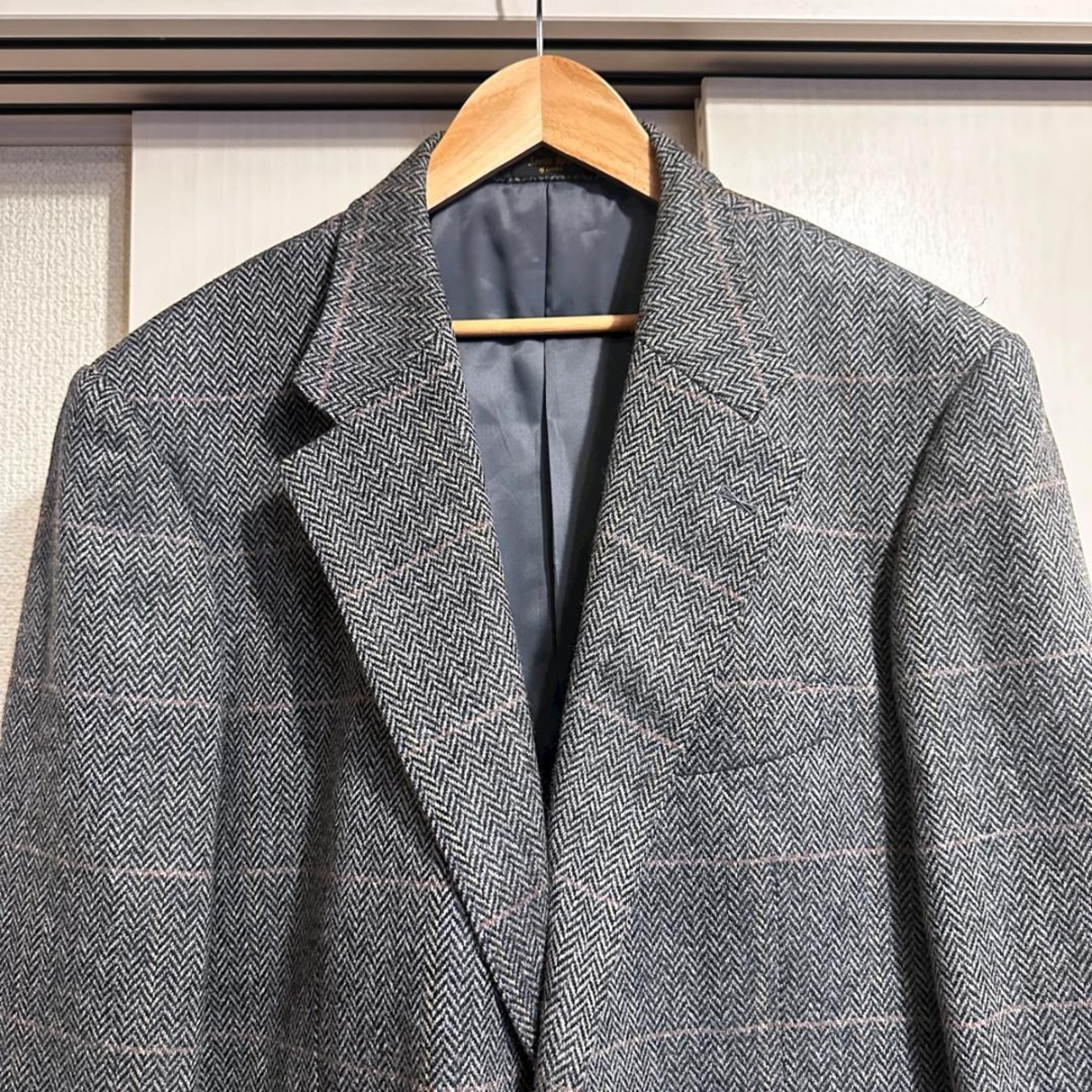 ブラウン系ヘリンボーン柄のジャケット。