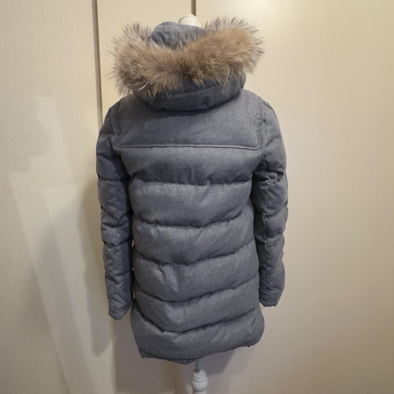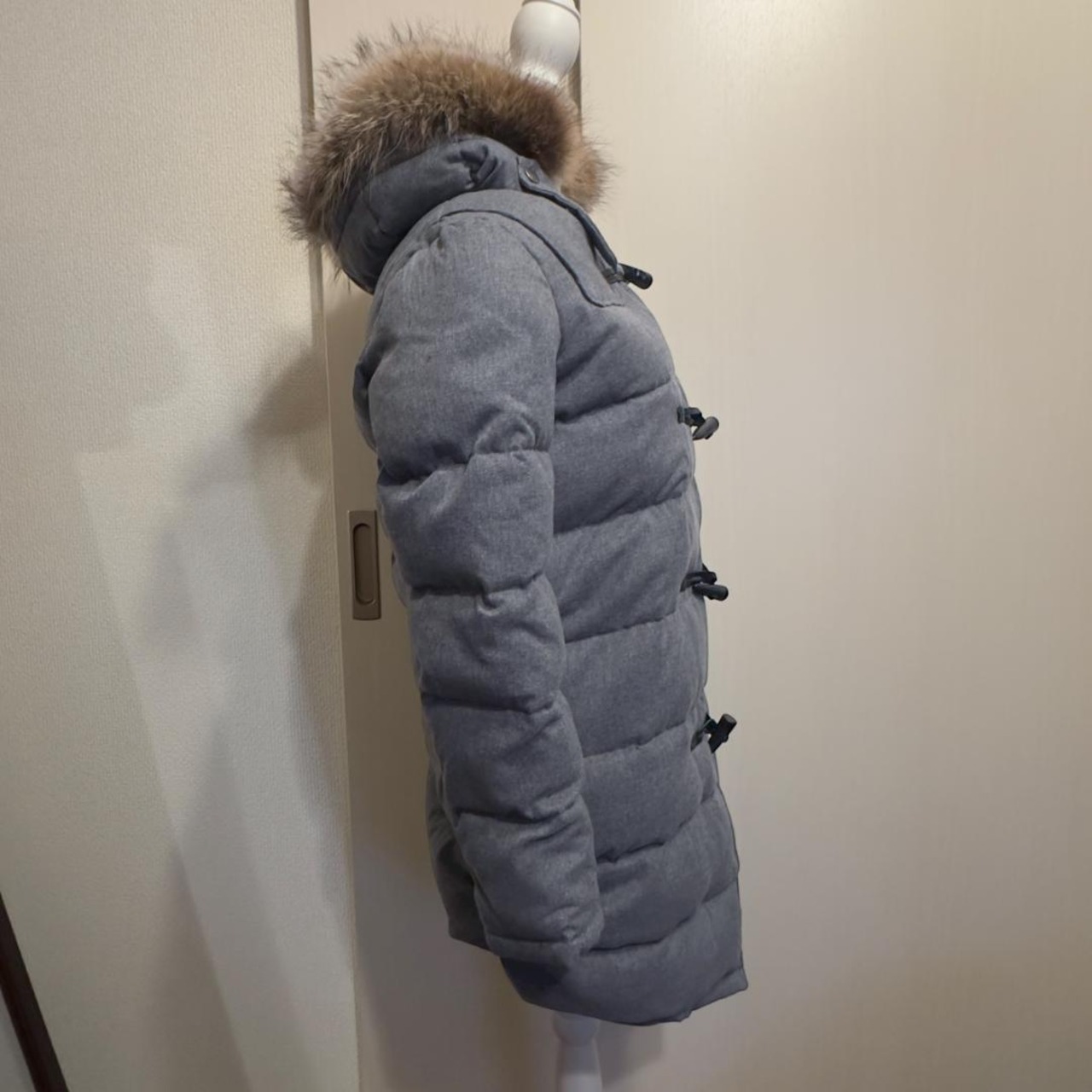 落ち着いたグレーカラーのダッフルダウンコート。
