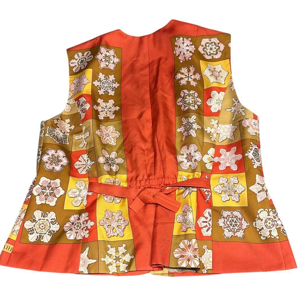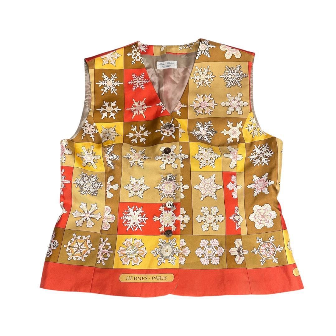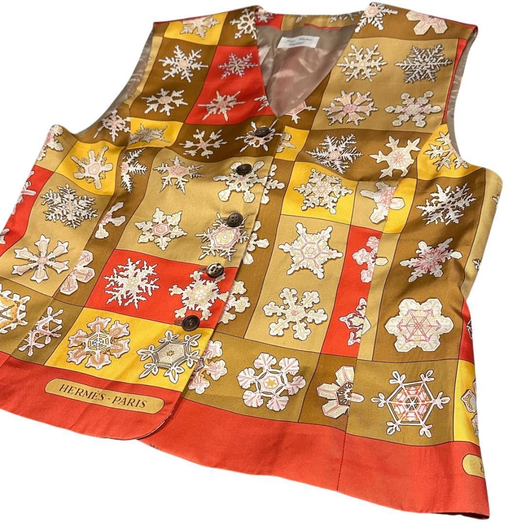 HERMÈSの銘品"FEUX DE L'HIVER"【冬の火 雪の結晶】スカーフを使用したリメイクベスト。その中でもエルメスのシグネイチャーカラーのオレンジを使用しているところに美しさがあります。