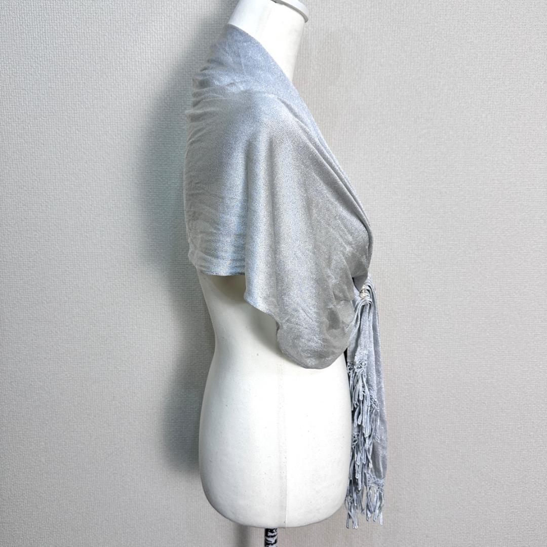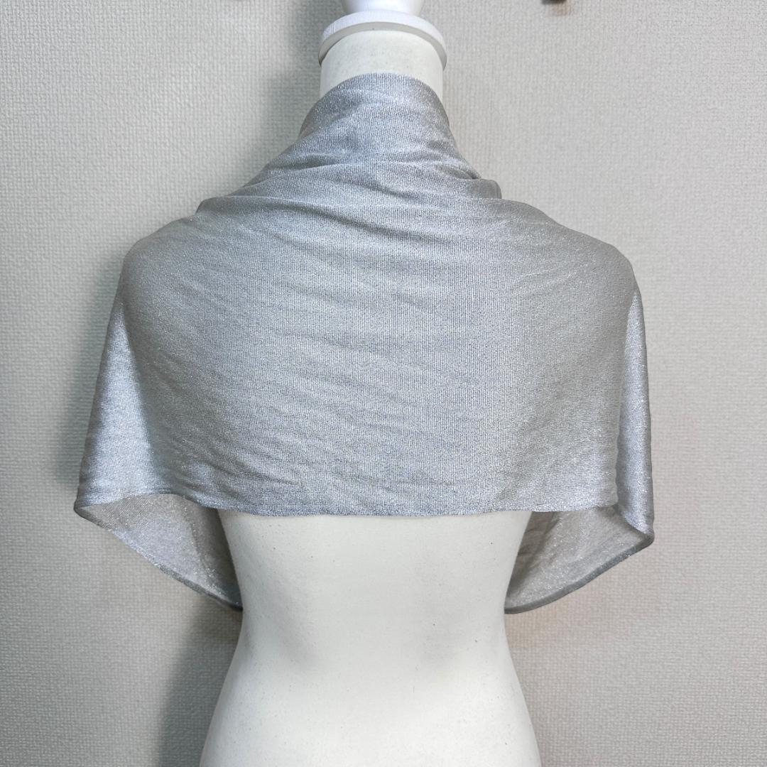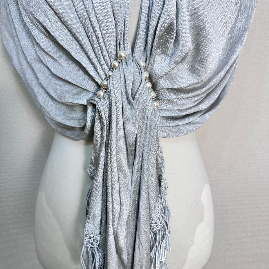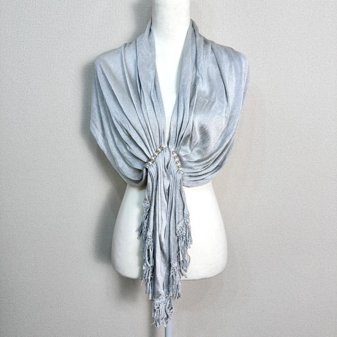 シルバーカラーのストールです。光沢感のある色味で、コーディネートに華やかさをプラスしてくれる一枚。シンプルな装いに合わせるだけでアクセントになり、フォーマル寄りのスタイルやパーティーシーンにもおすすめです。首元に巻くほか、肩掛けとしても活用いただけます。一般的な中古品として、使用感がある場合があります。