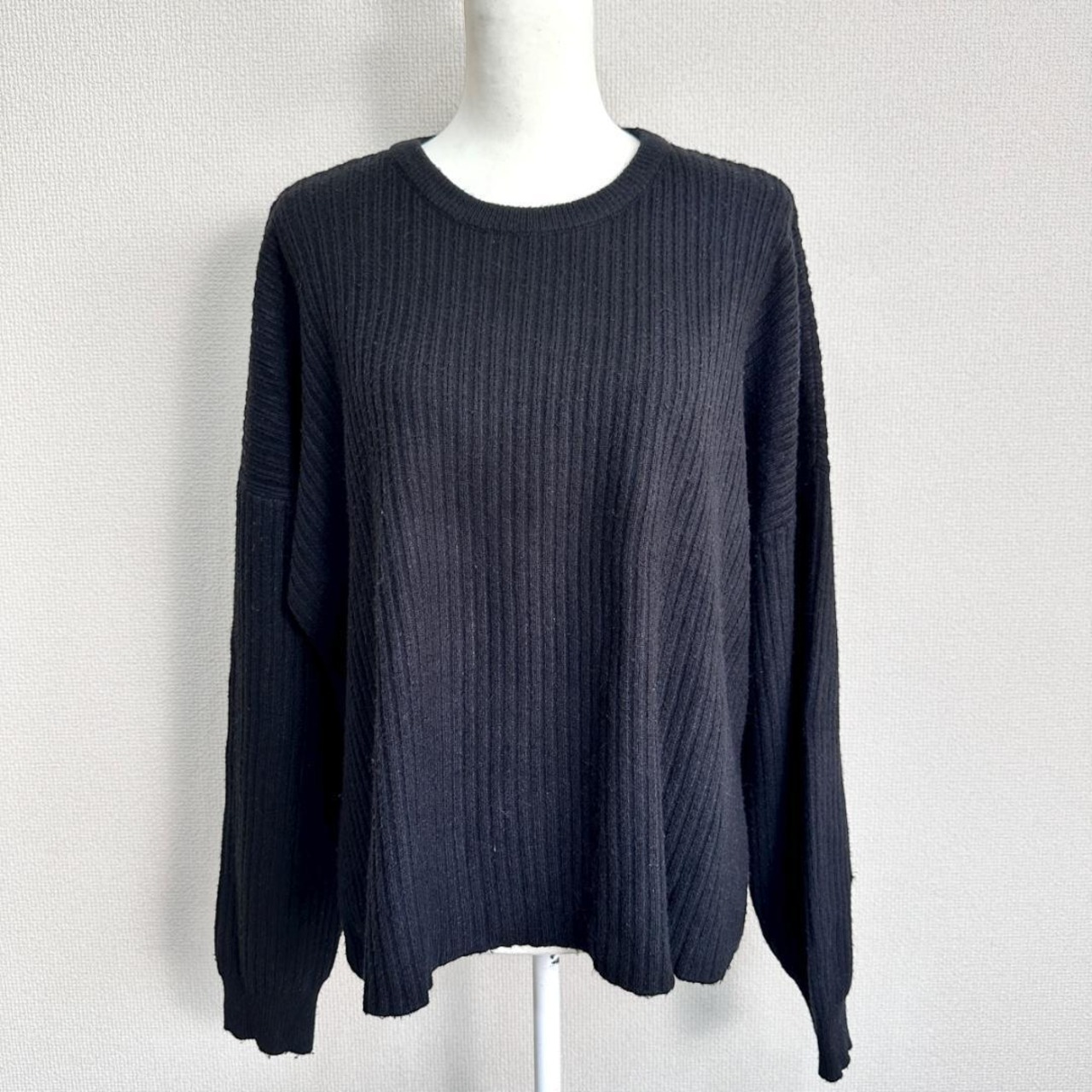 MEDE 19Fのブラックカラーセーターです。シンプルなデザインで、落ち着いた印象があり、幅広いコーディネートに取り入れやすい一着。身幅にゆとりのあるシルエットで、リラックス感のある着こなしが楽しめます。秋冬シーズンのデイリー使いに重宝するアイテムです。中古品のため、一般的な使用感がある場合があります。