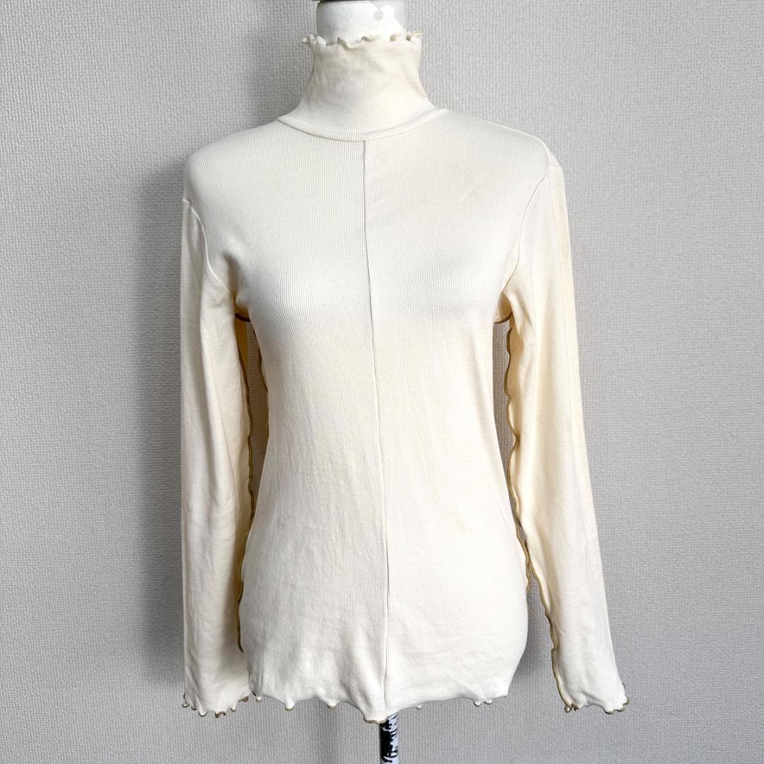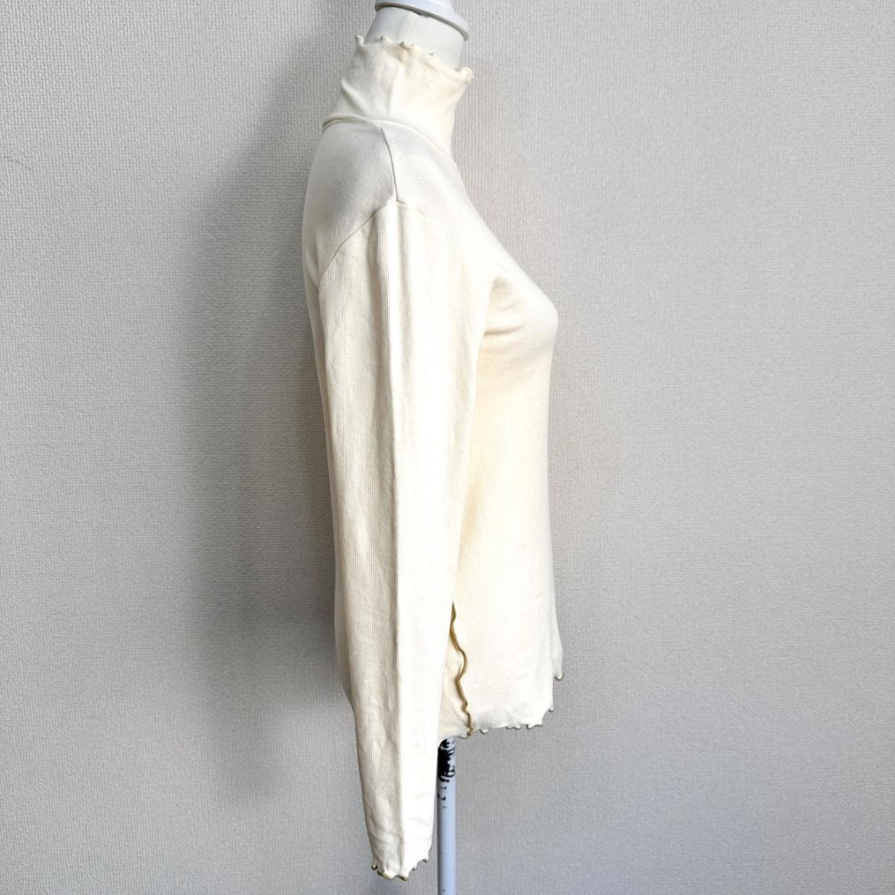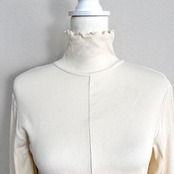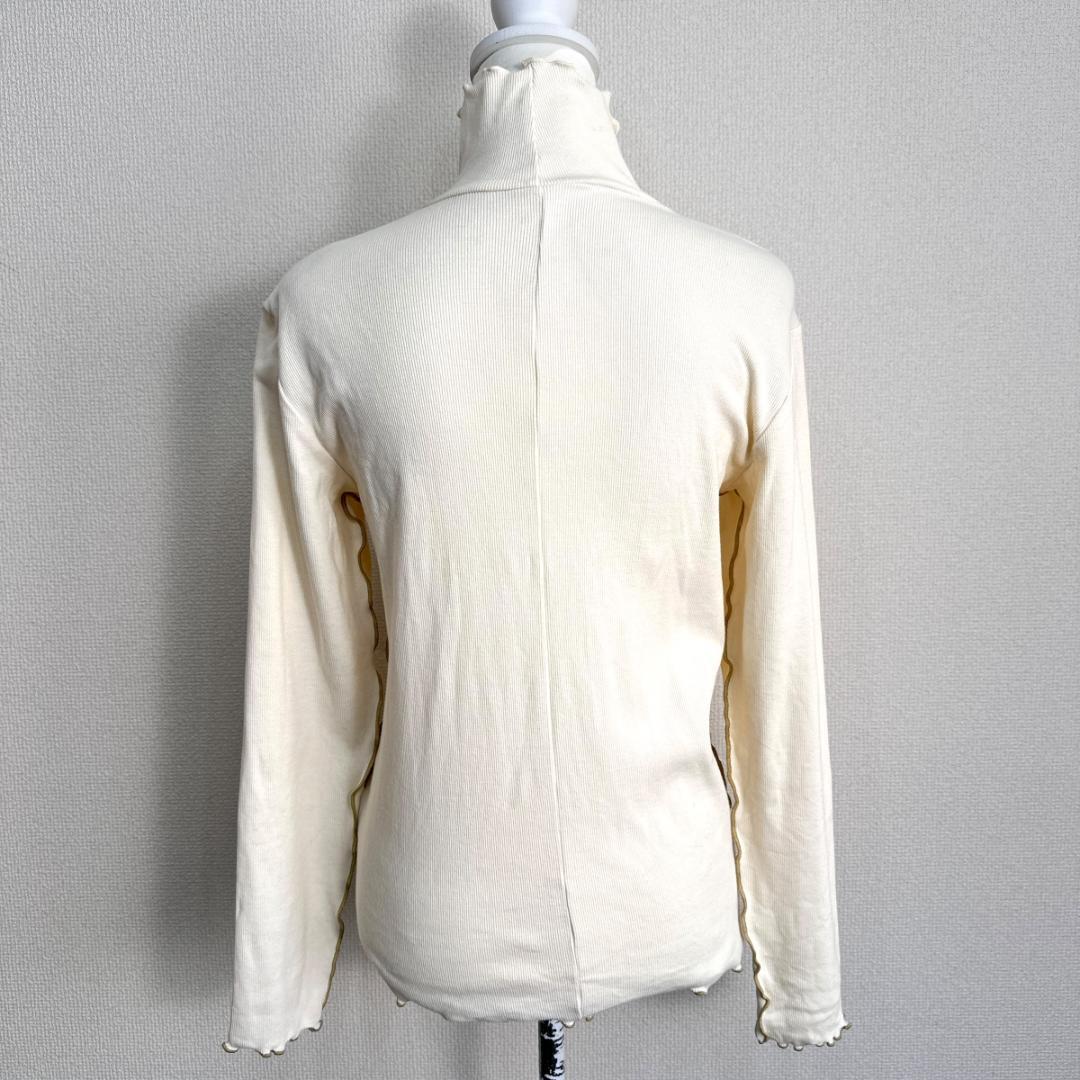 MADE 19Fのホワイトカラーのハイネックシャツです。首元まで程よくカバーするハイネックデザインで、上品かつすっきりとした印象の一着。シンプルな白カラーのため、インナー使いから一枚着まで幅広く活躍します。きれいめにもカジュアルにも合わせやすく、季節の変わり目にも重宝するアイテムです。中古品のため、一般的な使用感がある場合があります。