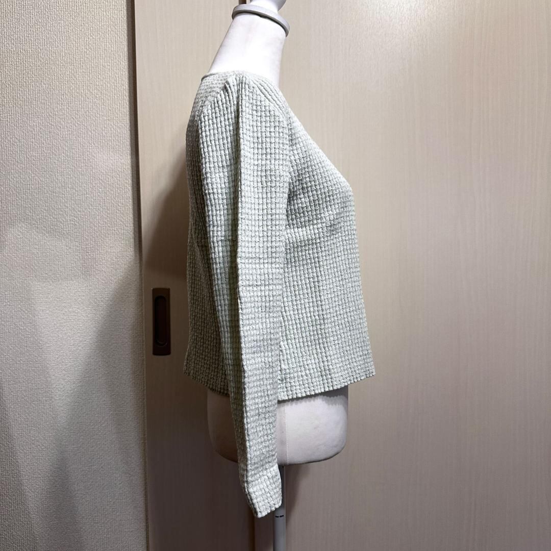 ・カーディガンは肩幅35cm/バスト93cmで、身体に沿いすぎない程よいフィット感。