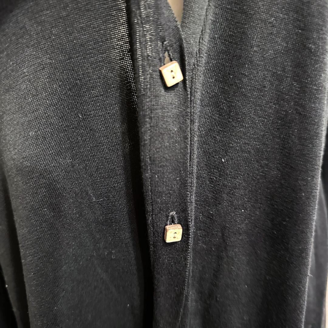 #DAISYLINforfoxy のブラックカーディガンです。上品でシンプルなデザインが特徴で、羽織るだけで大人の洗練された雰囲気を演出してくれる一枚。柔らかく軽やかな素材感で着心地が良く、きれいめスタイルからカジュアルコーデまで幅広く活躍します。スカートやパンツ、ワンピースとの相性も良く、オンオフ問わず長く愛用できる万能アイテムです。