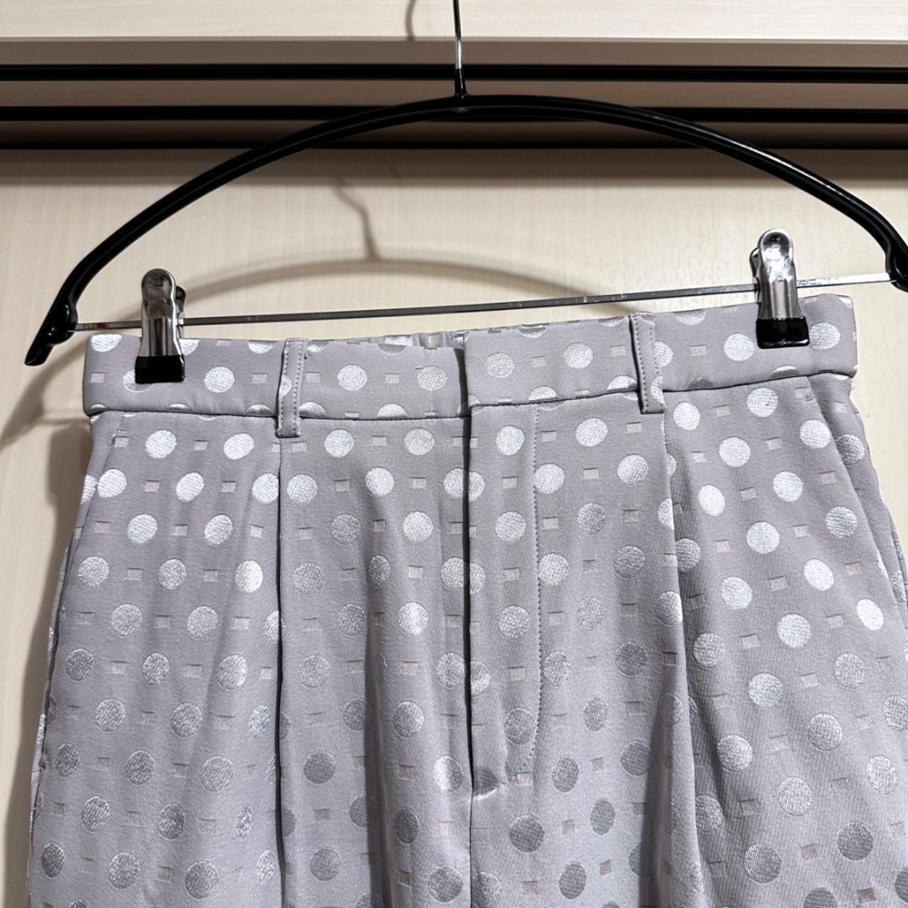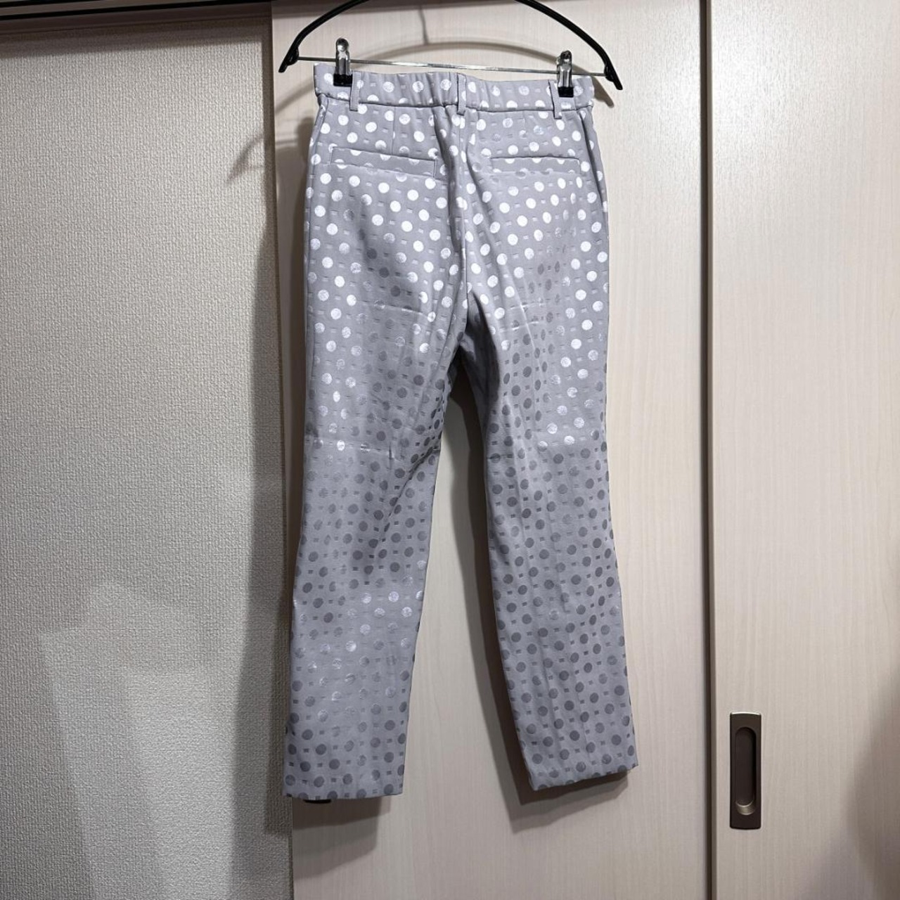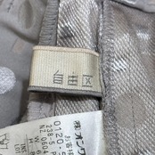 自由区の水玉柄パンツです。やわらかなベージュにドット柄が上品に映えるデザインで、大人のカジュアルスタイルにぴったり。軽やかな素材感で、春夏シーズンに快適に着用できます。