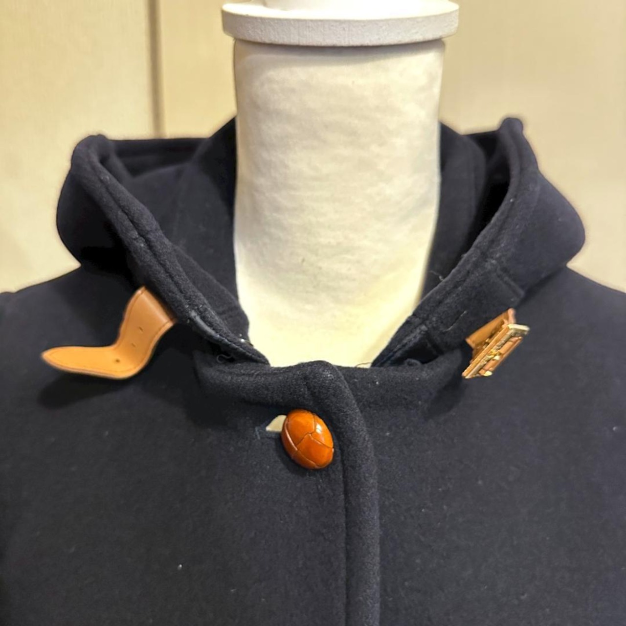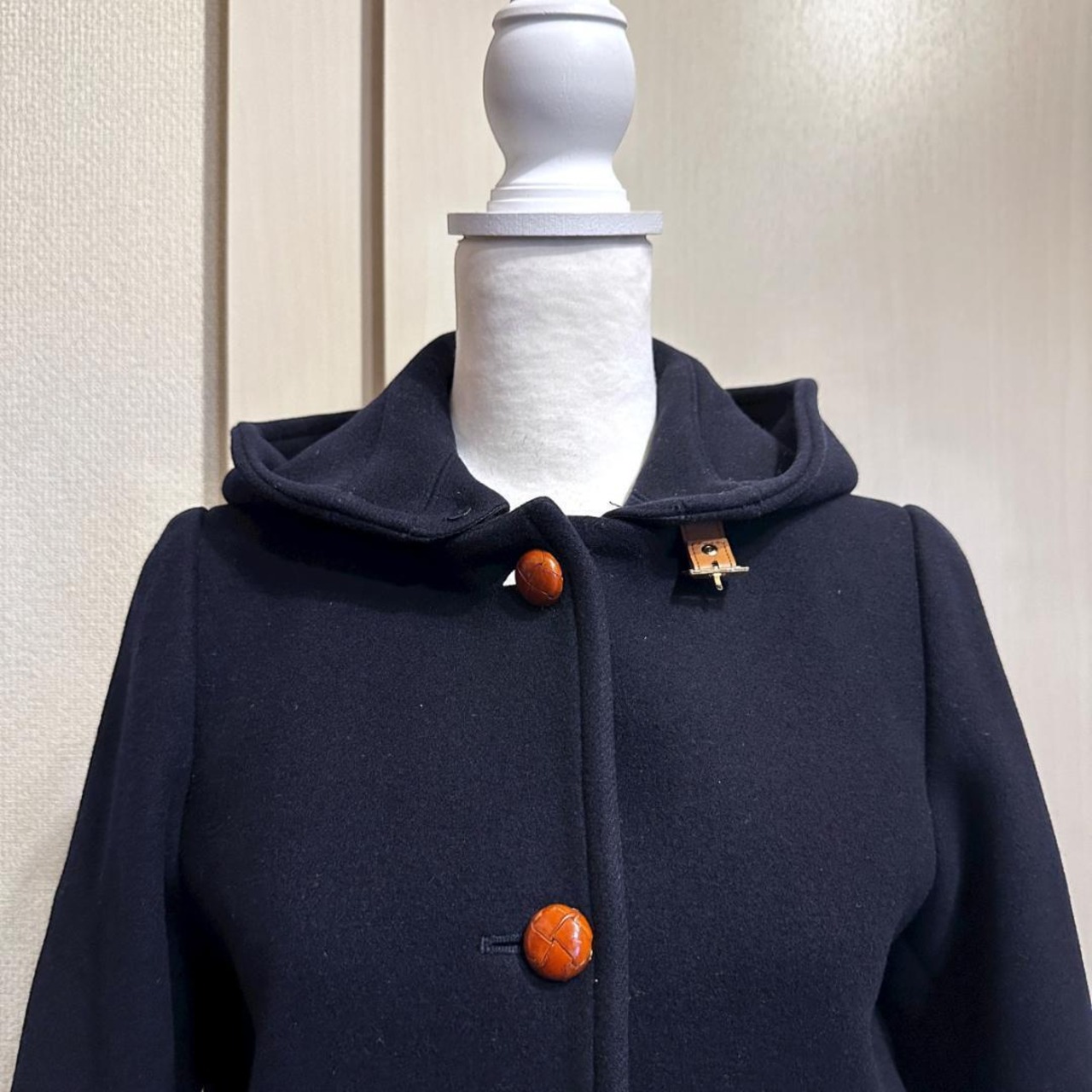 IENAのコートです。上品なネイビーカラーが特徴で、シンプルながらも洗練されたデザイン。きれいめからカジュアルまで幅広いスタイルに合わせやすく、秋冬シーズンのアウターとして重宝する一着です。