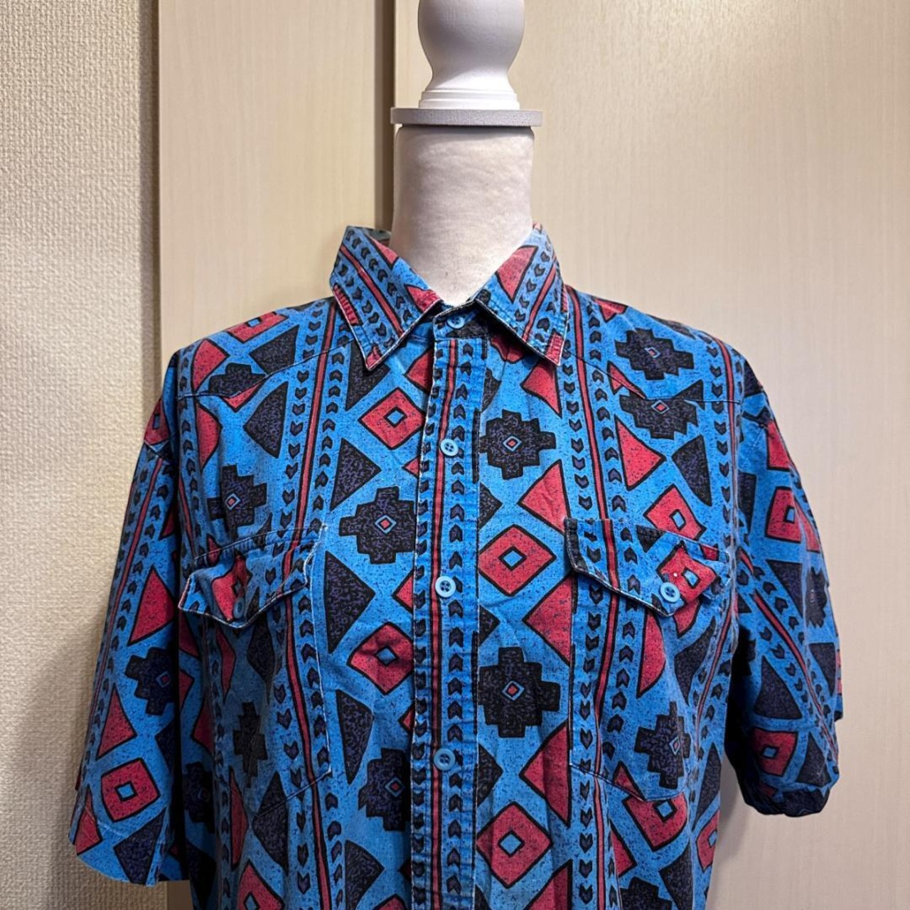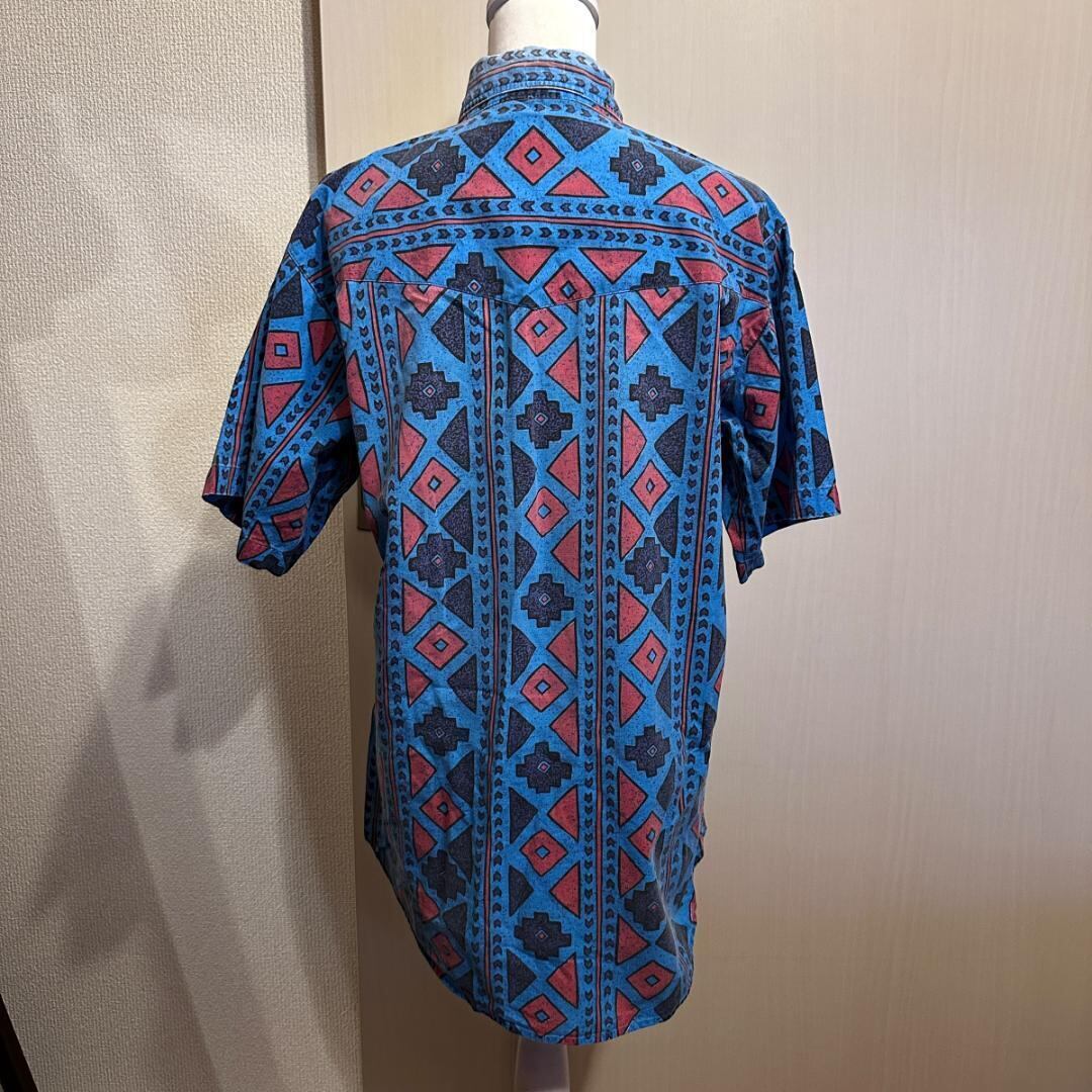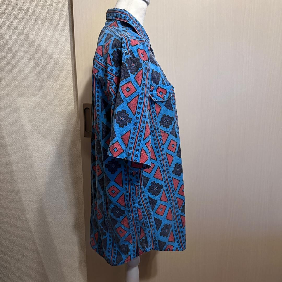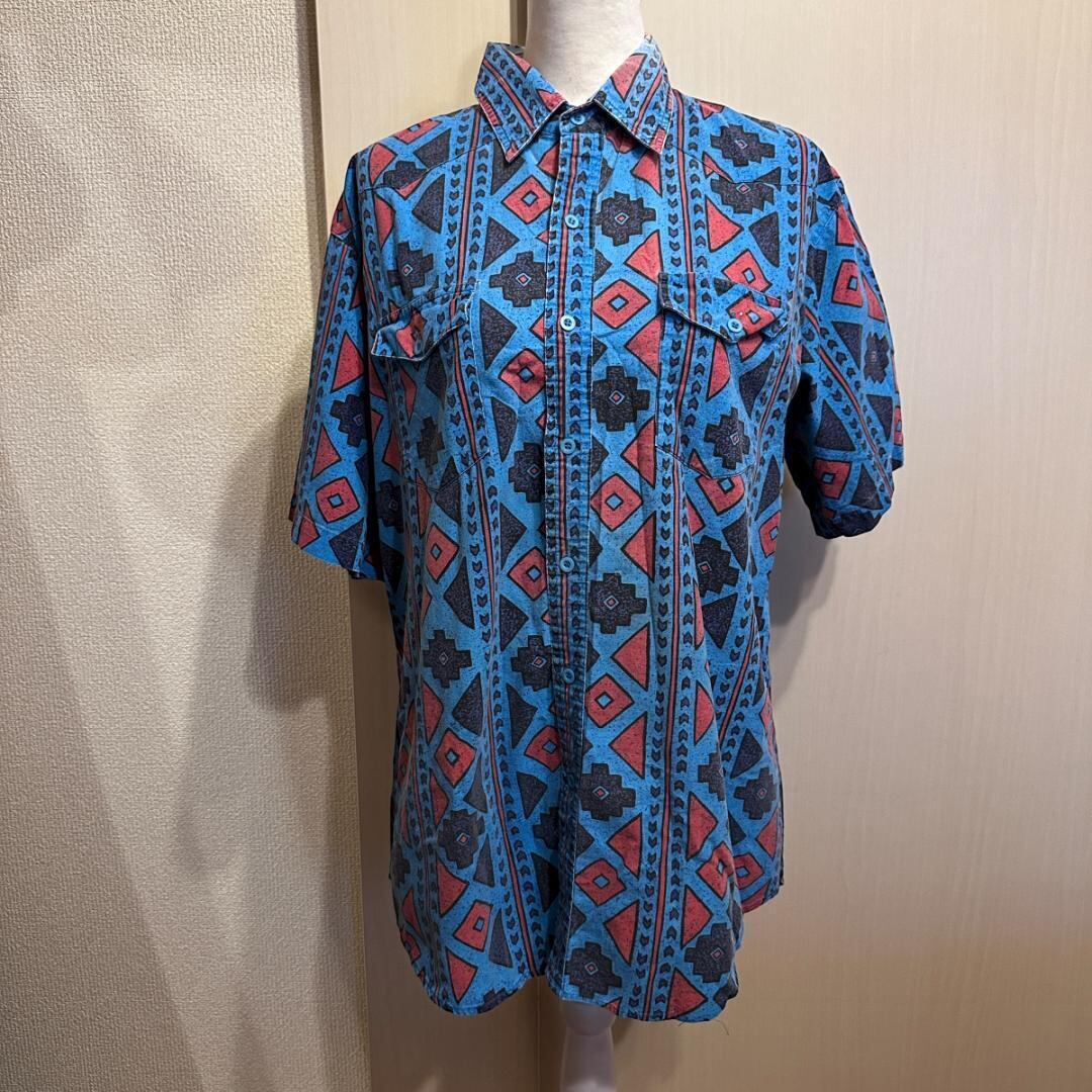 Wranglerのネイティブ柄半袖シャツです。鮮やかな柄が存在感のある一枚で、カジュアルスタイルのアクセントに最適。リゾートや夏のコーディネートにも活躍します。左脇にほつれがありますので、状態をご了承の上でのご購入をお願いします。