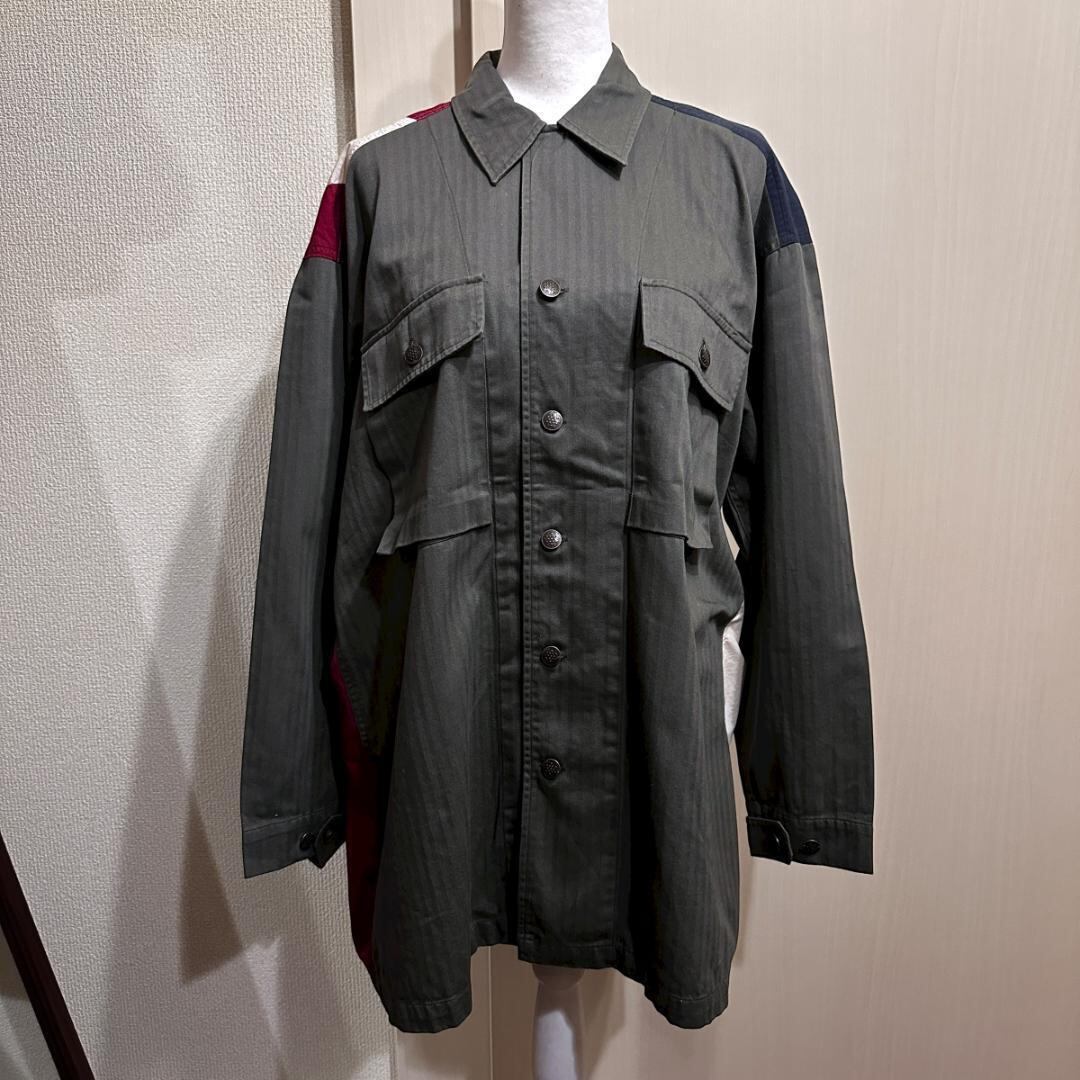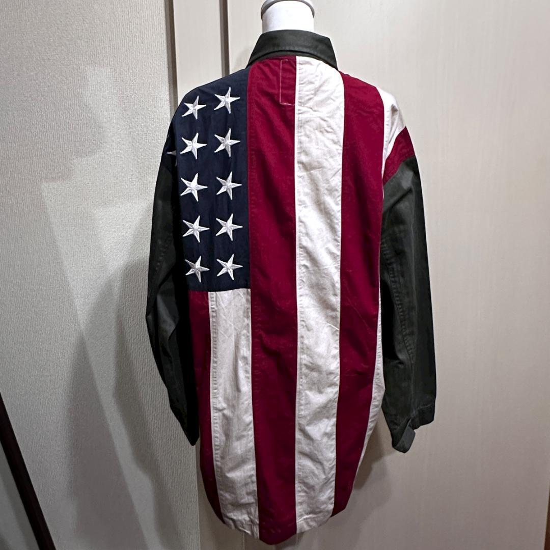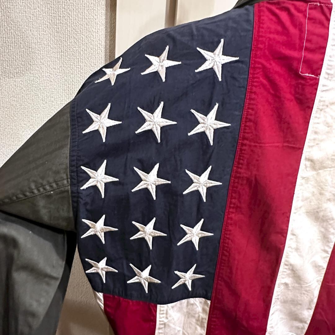 オリーブカラーをベースに、アメリカ国旗柄が印象的なシャツ。