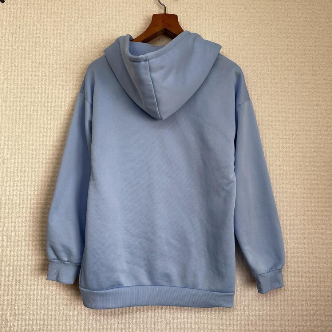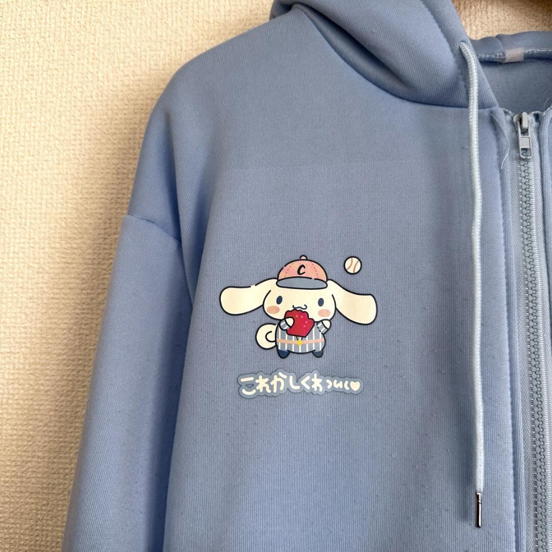 シナモンロールのデザインがあしらわれたパーカー。やさしい水色カラーで、可愛らしさとカジュアルさを兼ね備えた一枚です。タグ・サイズ表記はありませんが、全体的にゆとりのある作りで、リラックス感のある着用が楽しめます。デイリーコーデやルームウェア感覚でも取り入れやすいアイテムです。