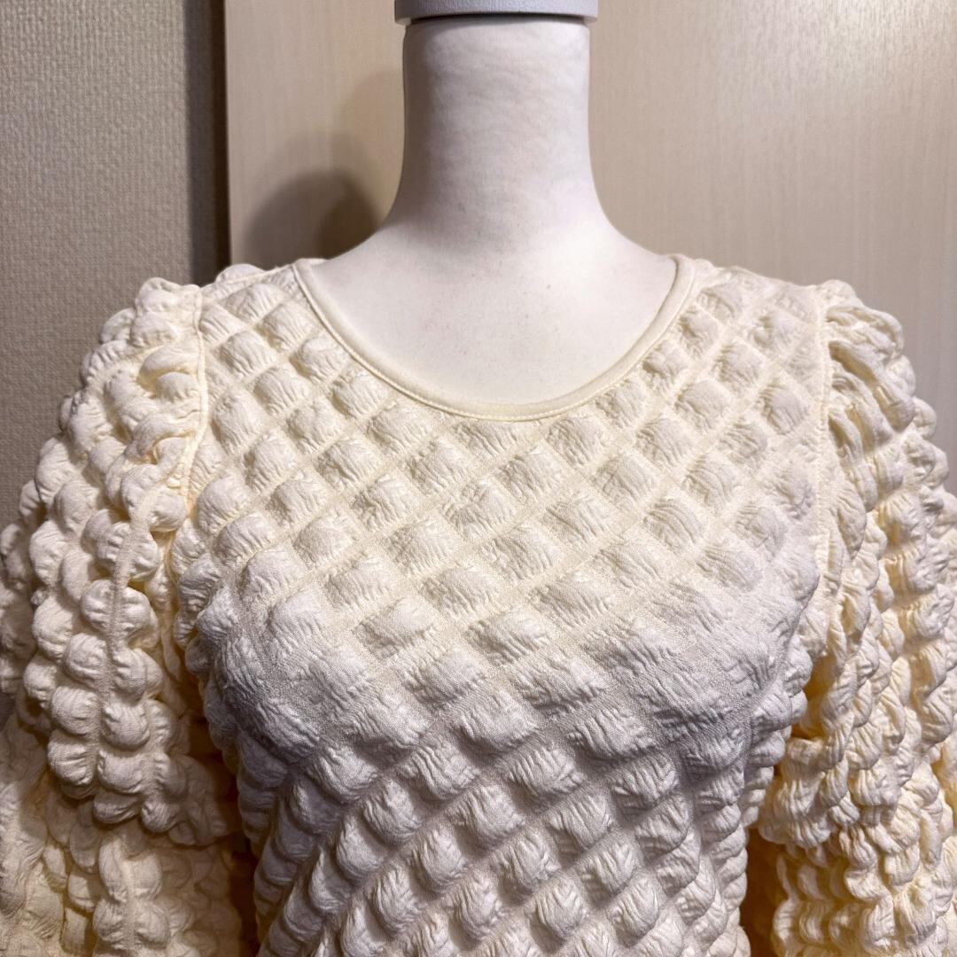 SLY(スライ)の長袖カットソー。表面にポップコーンのような凹凸のある生地感が特徴で、シンプルながら個性を感じさせる一着です。ホワイトカラーでどんなボトムスにも合わせやすく、カジュアルからきれいめコーデまで幅広く活躍します。柔らかく伸縮性のある素材で着心地も快適です。