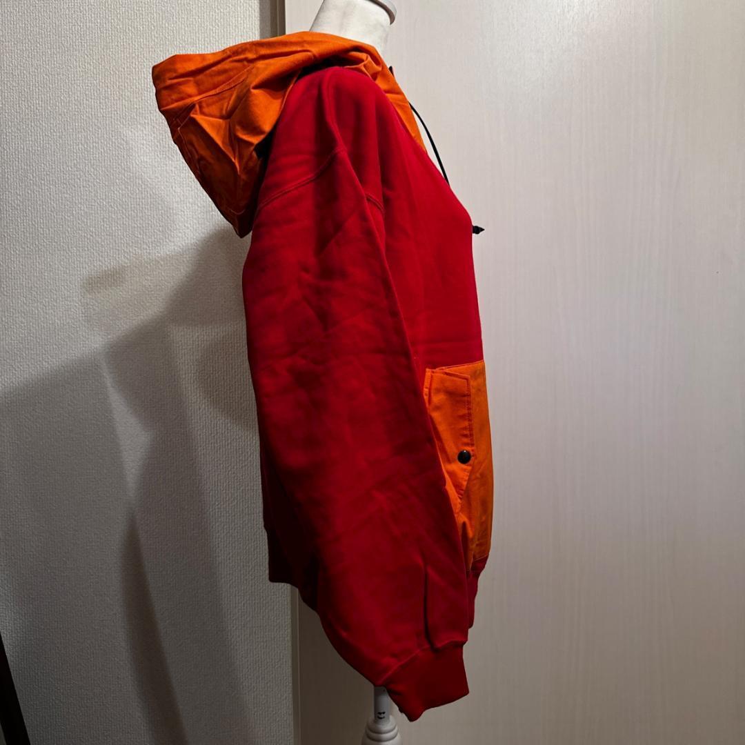 赤×オレンジの配色が目を引くパーカー。