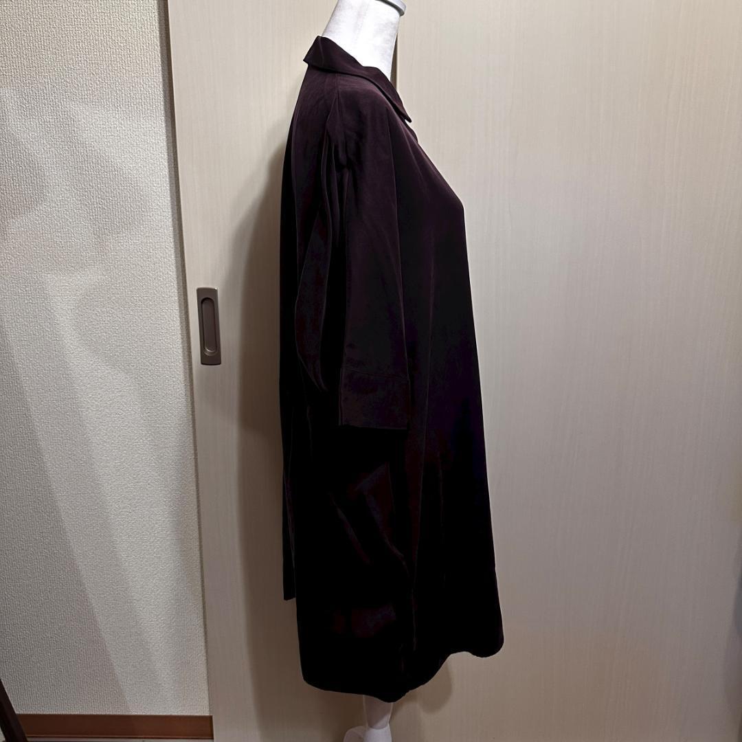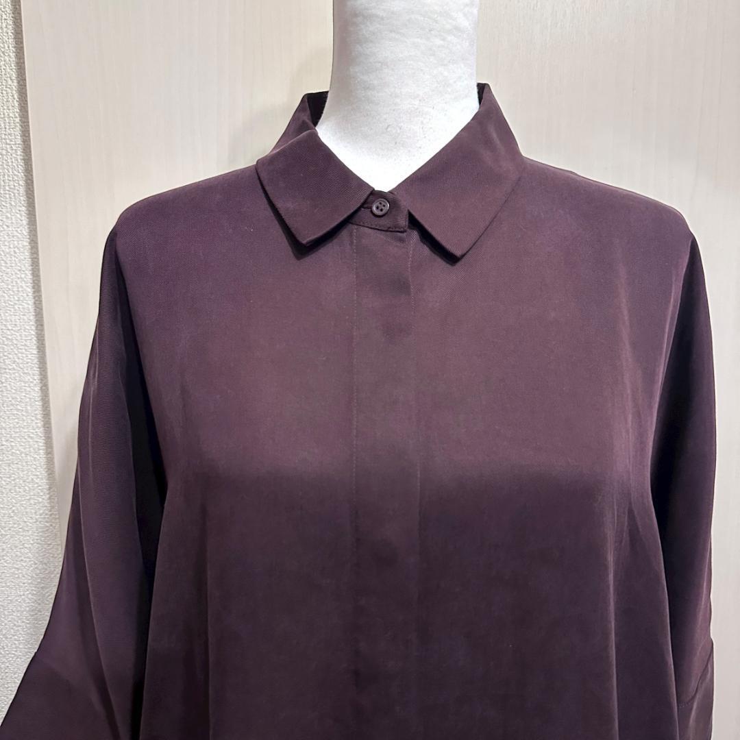 落ち着いたブラウンカラーで、シンプルながらもモード感のある一着。ゆったりとしたシルエットで体のラインを拾いにくく、1枚でさらっと着用できるデザインです。
